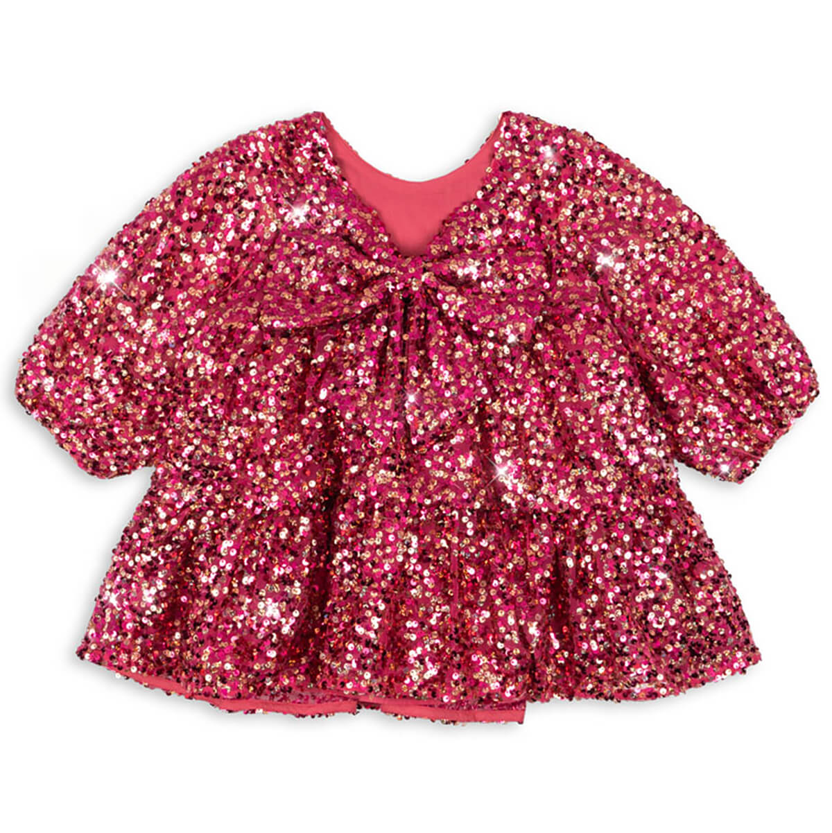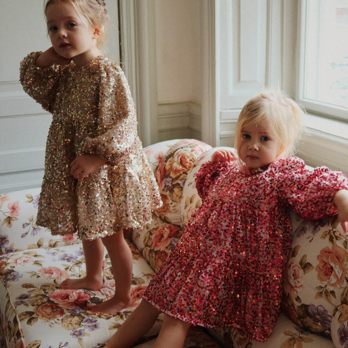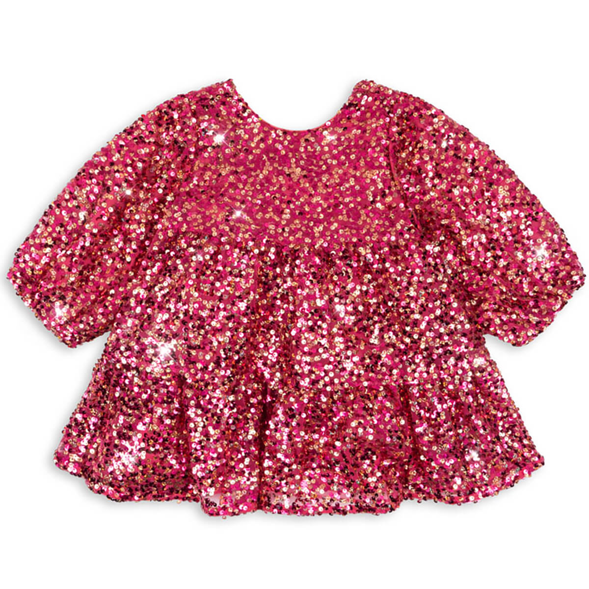 Lila Dress by Konges Sløjd. The perfect showstopper: the Lila dress is covered in sparkly sequins and features decorative balloon sleeves and a flared skirt with a soft cotton lining.