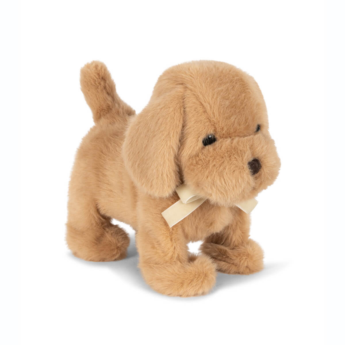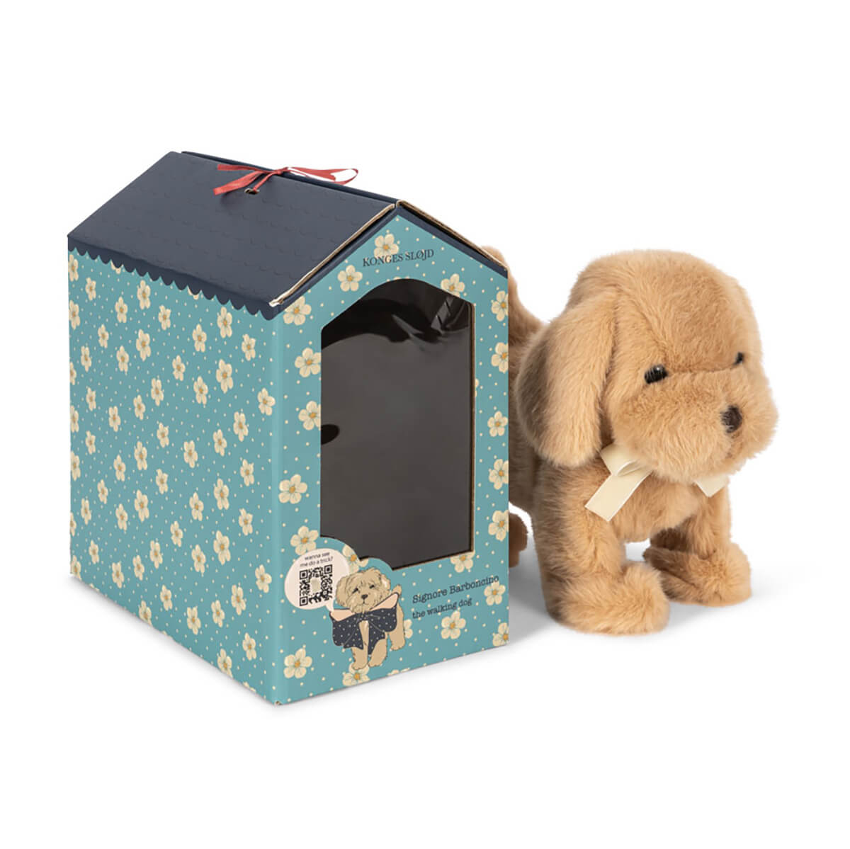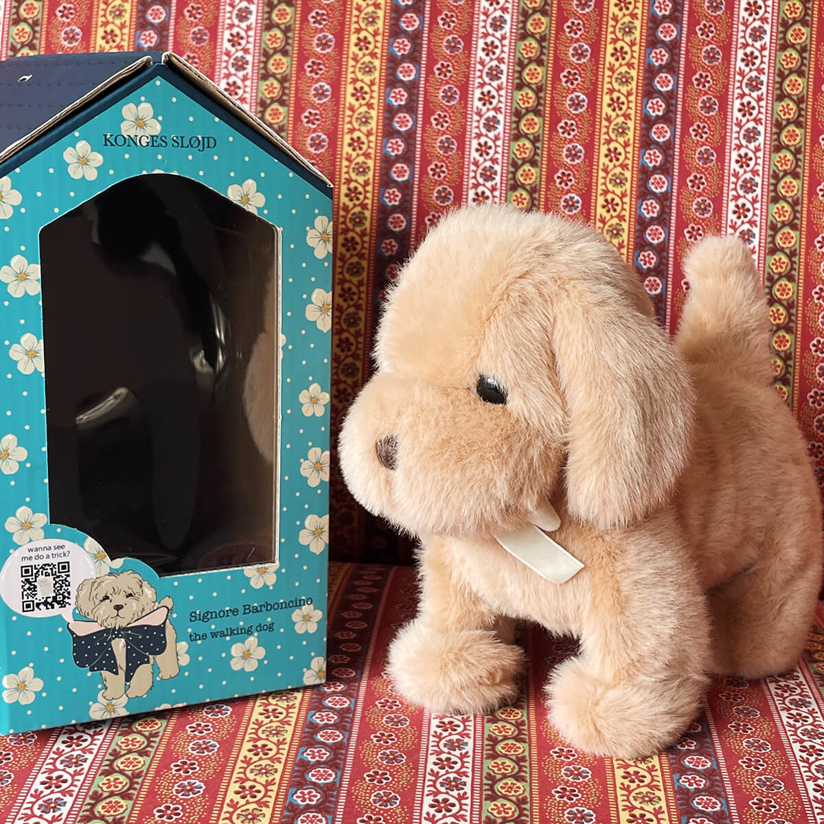 Walking Dog by Konges Sløjd. The Walking Dog is soft and fluffy, loves cuddles, and even walks, barks, and wags its tail like a real life pet. The Walking Dog comes with its very own little dog house that can be used for cute and convenient storage in the kids' room.
