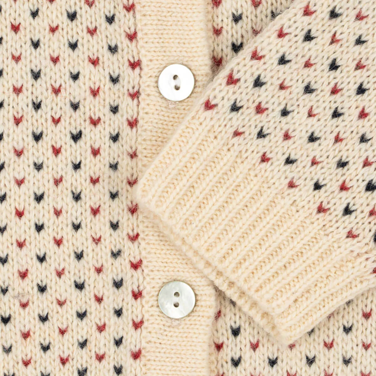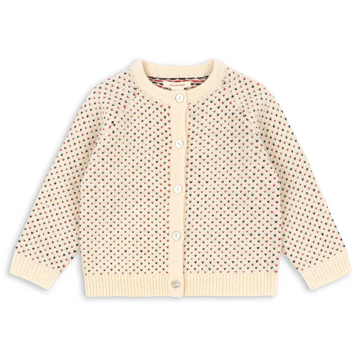 Billi Cardigan by Konges Sløjd. Warm knit cardigan in a fluffy wool blend. Classic design with a round neck, rib edges, and mother of pearl buttons in front.