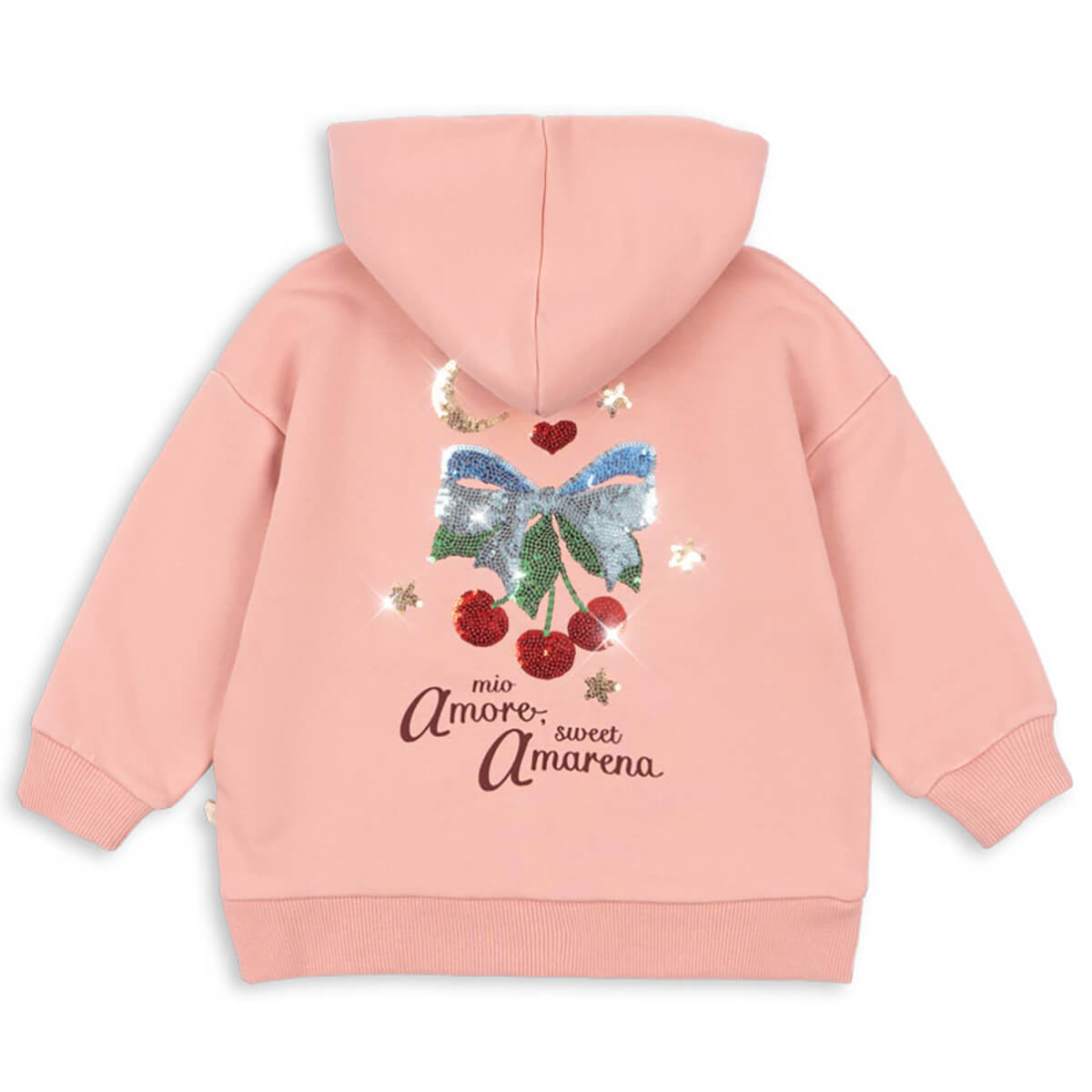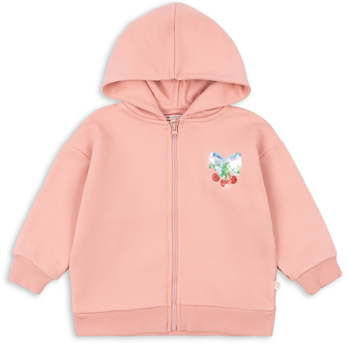 Lou Sequin Zip Hoodie by Konges Sløjd. Soft hoodie with a sequin pattern on the back. Made from organic cotton with a hint of stretch. Features a full zipper closure in front and a soft hood.
