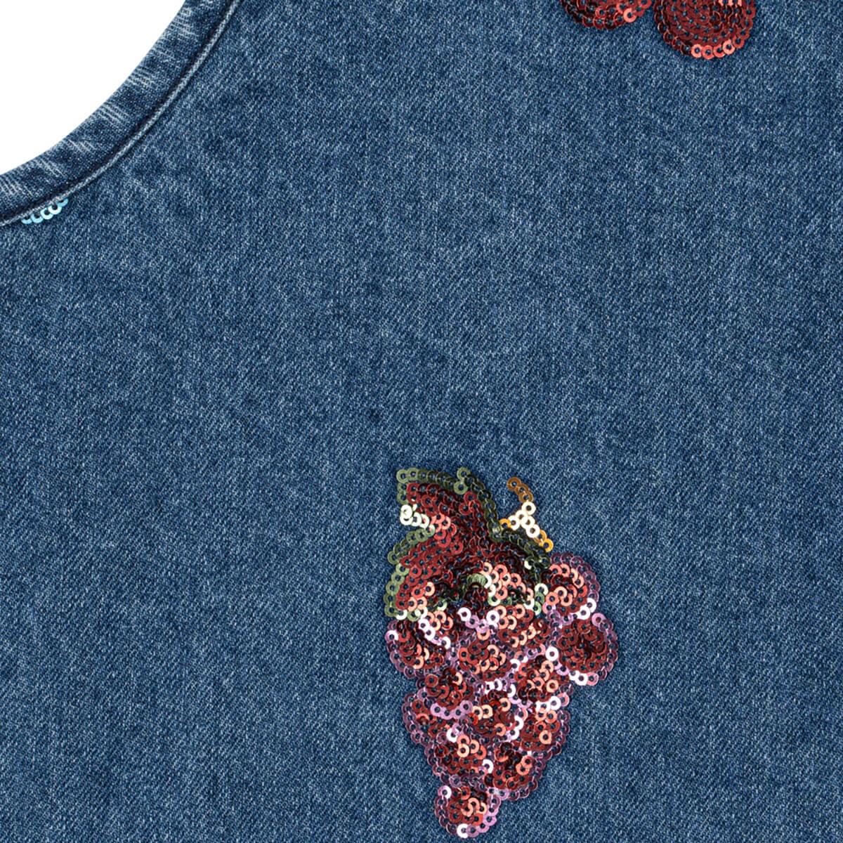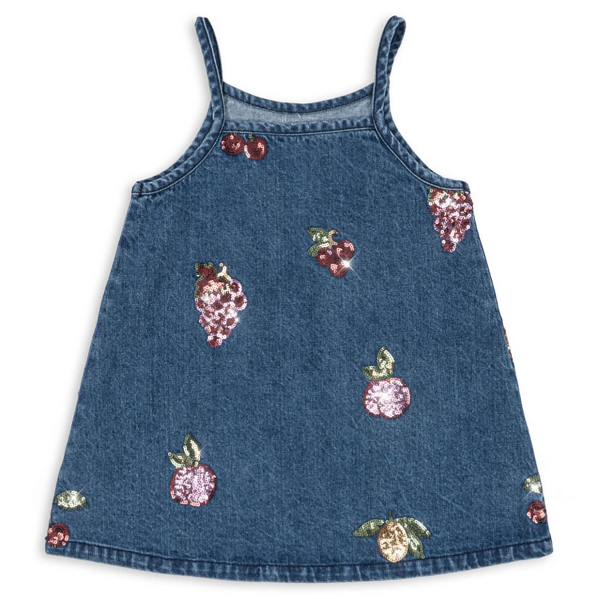 Magot Dress by Konges Sløjd. Denim strap dress with embroidered sequin fruits.