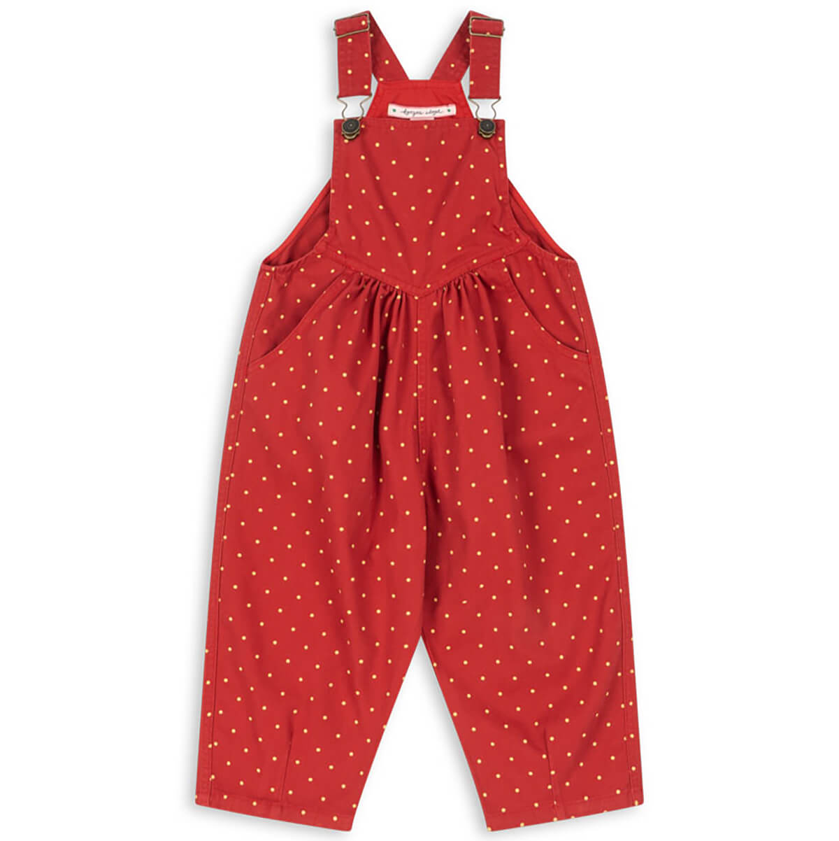Nola Overalls by Konges Sløjd. Classic dungarees with signature logo buttons and an adorable all over dot print.