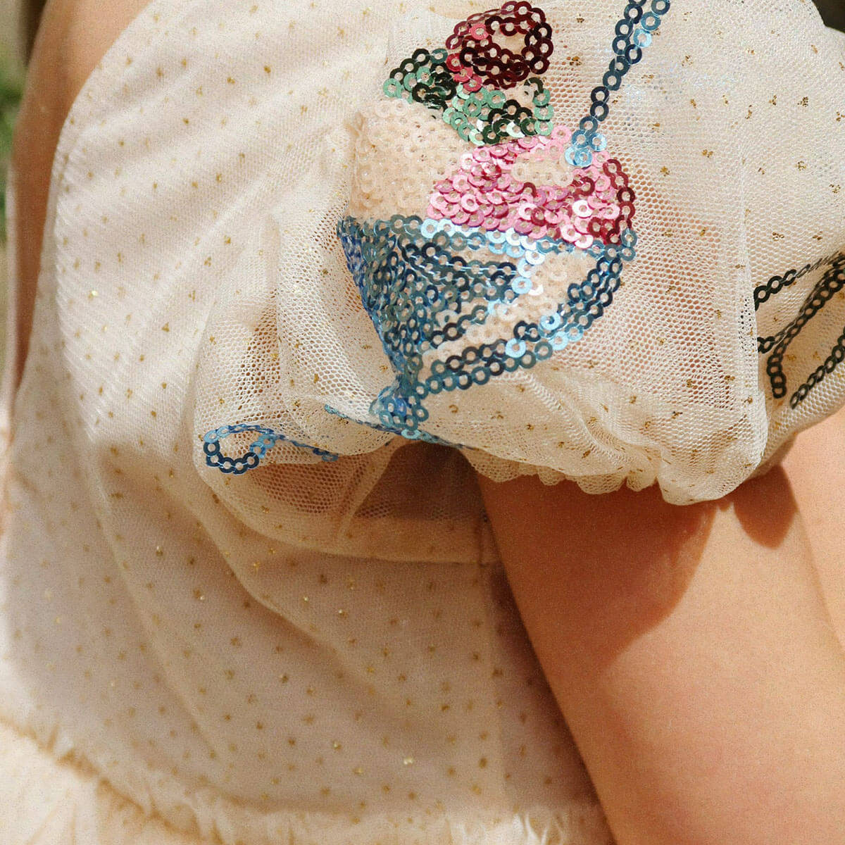 Yvonne Puff Dress by Konges Sløjd. Voluminous tulle dress with short puff sleeves. The dress is designed in a flowy silhouette with a skirt that swooshes and sways when you play and dance, and is adorned with decorative sequin embroidery for the perfect finishing touch. Lined with soft cotton for comfortable wear.