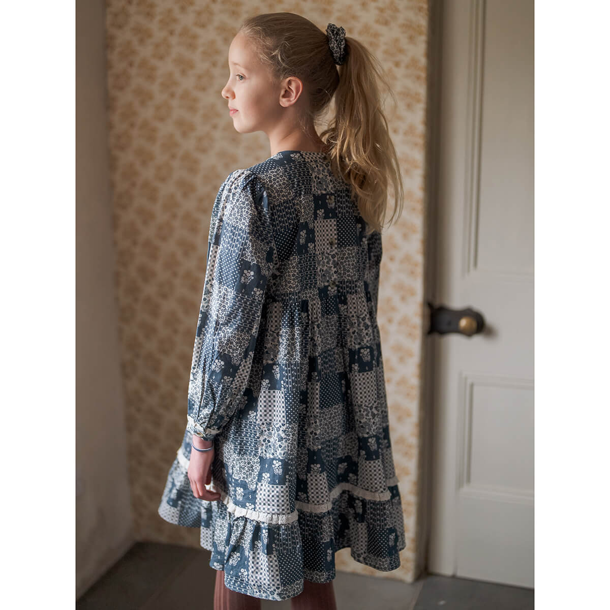 Florrie Dress by Little Cotton Clothes. A beautiful prairie style dress, with deep pockets for treasure and neat little cuffs at the wrists. A longer length dress, it is made in beautiful patchwork print, with pretty cotton trim to the skirt and cuffs.