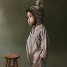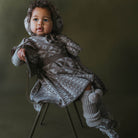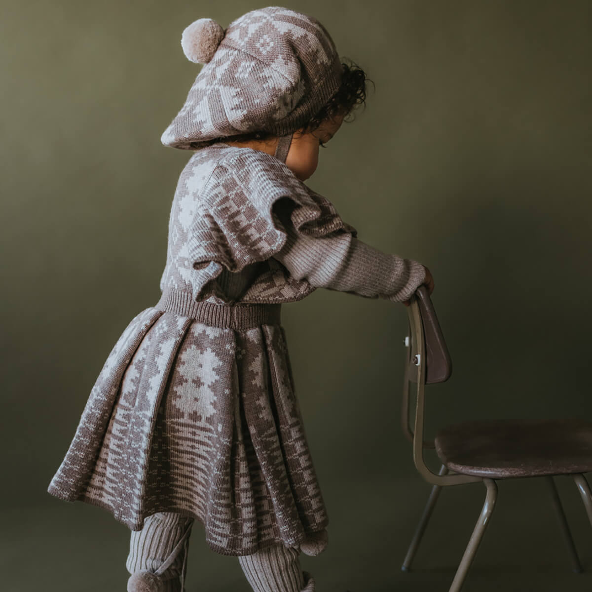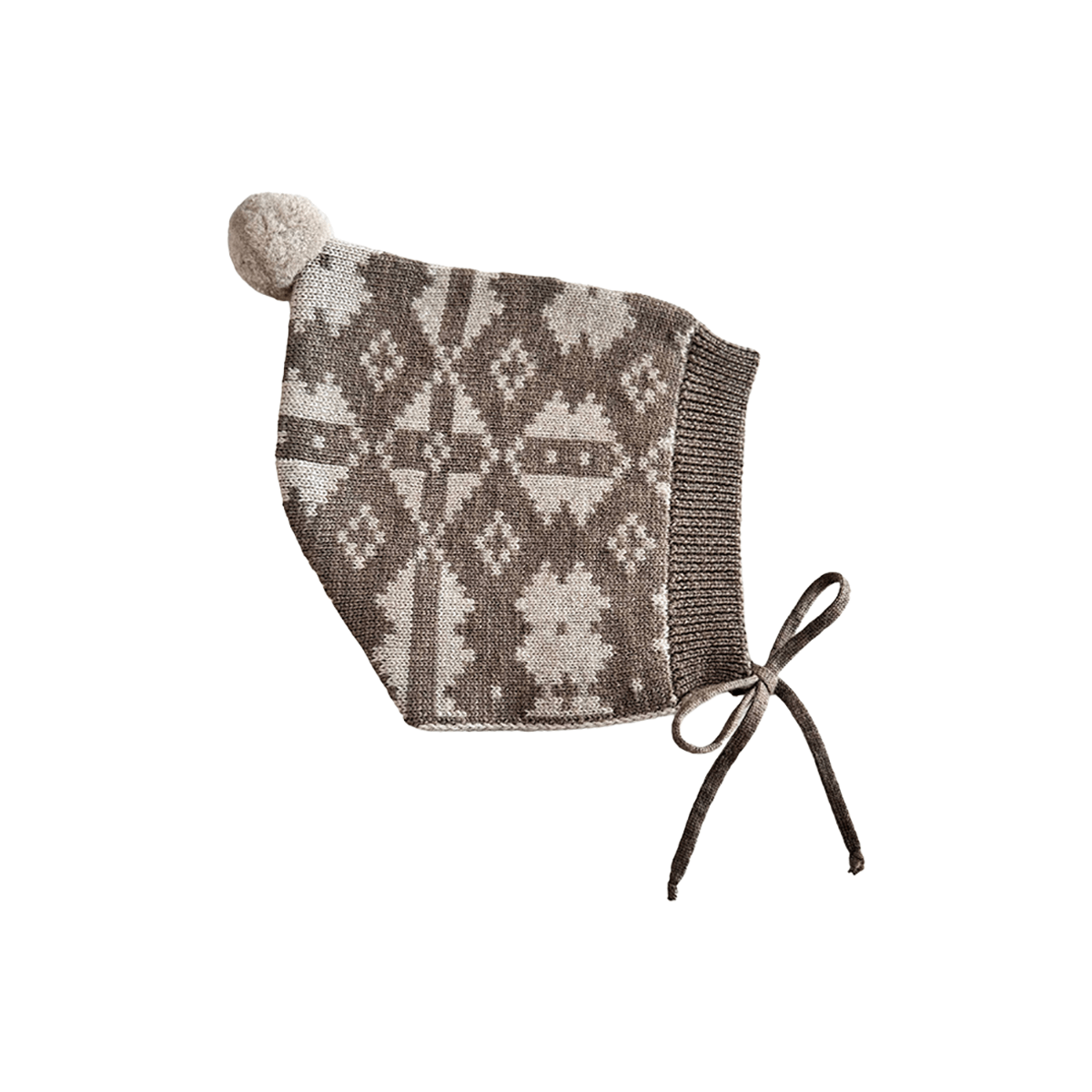 Eryri Bonnnet by Mabli. A cosy pixie-style bonnet, secured with under-chin ties and topped with a pom-pom. Knitted in a mid-weight jacquard pattern inspired by traditional Welsh tapestry.