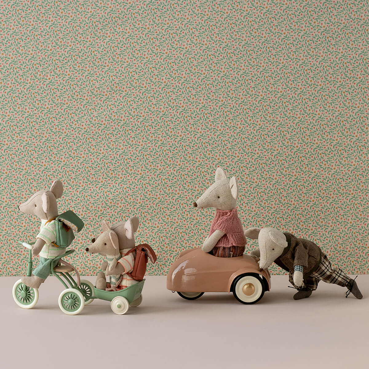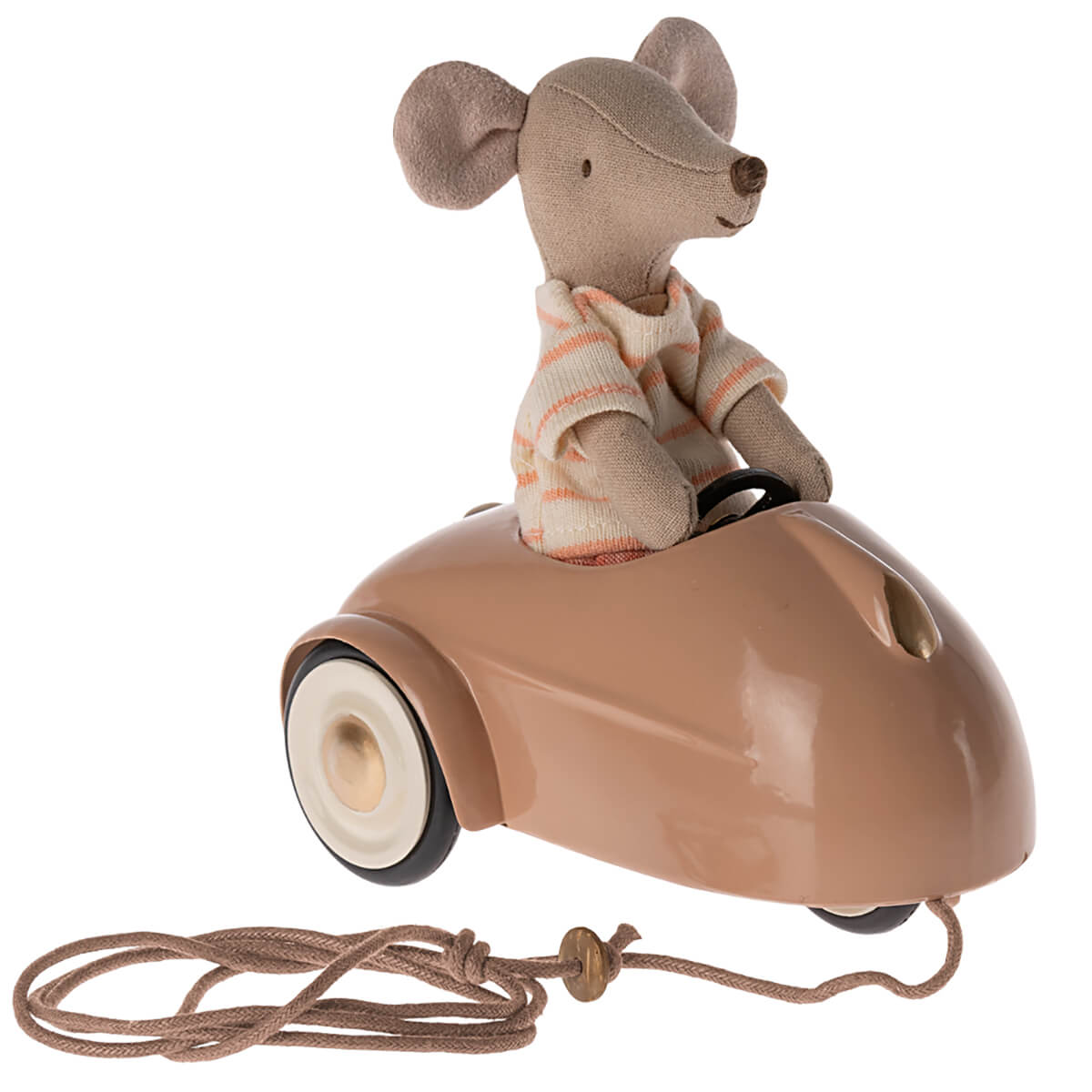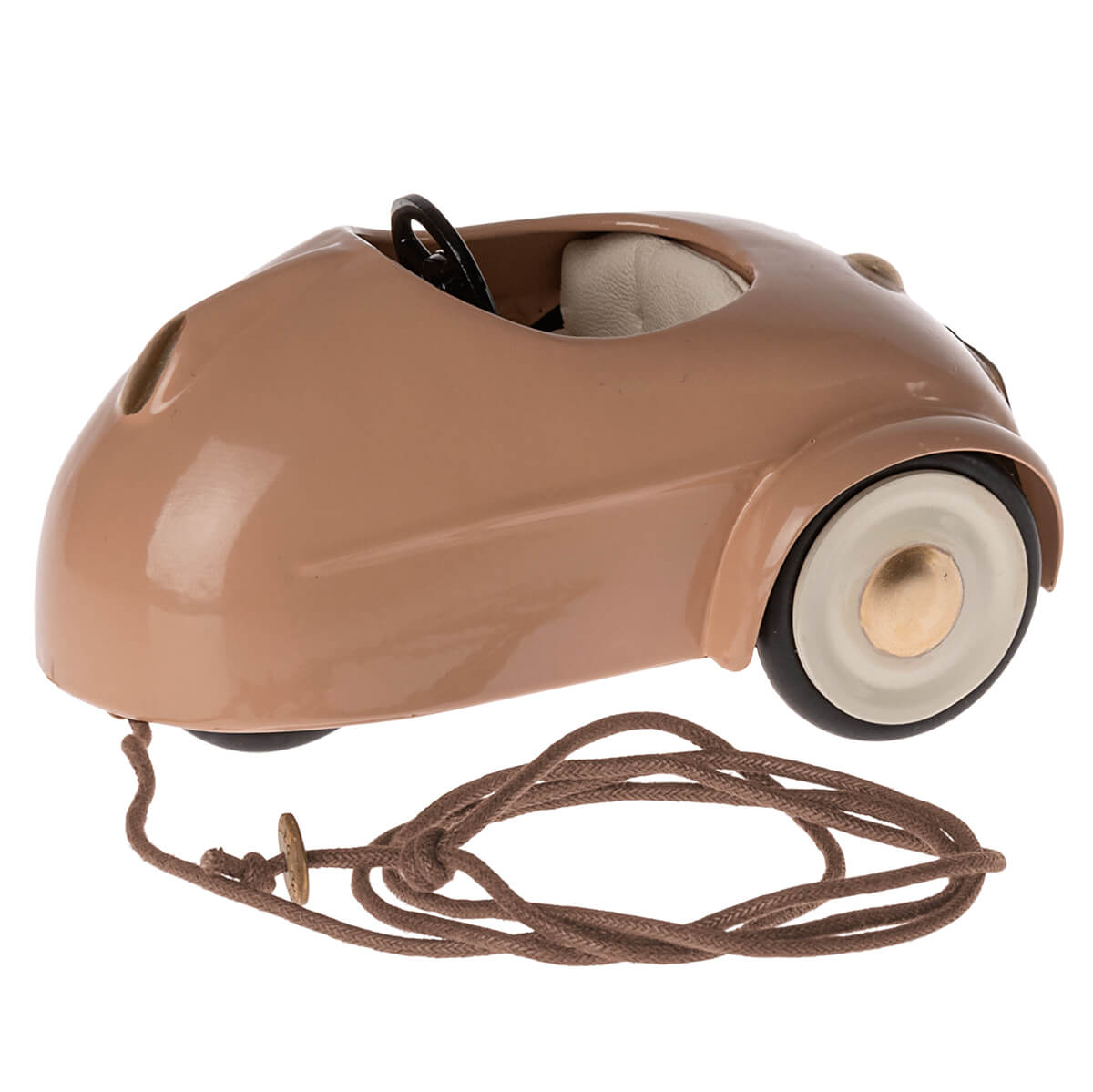 Mouse car in dark powder by Maileg. This metal car is a perfect transportation for any mice. It fits all mice in sizes little brother/sister, big brother/sister and mum/dad. The string included can be fastened under the car so the child can pull the car.