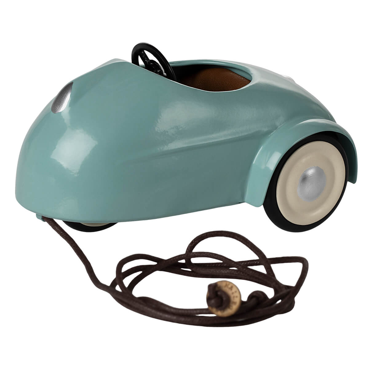 Mouse car in light blue by Maileg. This metal car is a perfect transportation for any mice. It fits all mice in sizes little brother/sister, big brother/sister and mum/dad. The string included can be fastened under the car so the child can pull the car.
