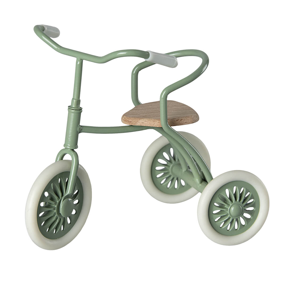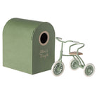 Mouse tricycle and garage by Maileg. Big brother/sister mice fit this tricycle perfectly. Mice with magnets in their hands can easily hold the handles. This beautiful bike comes in a garage box to expand the play. A basket can be bought separately and added to the handlebar.