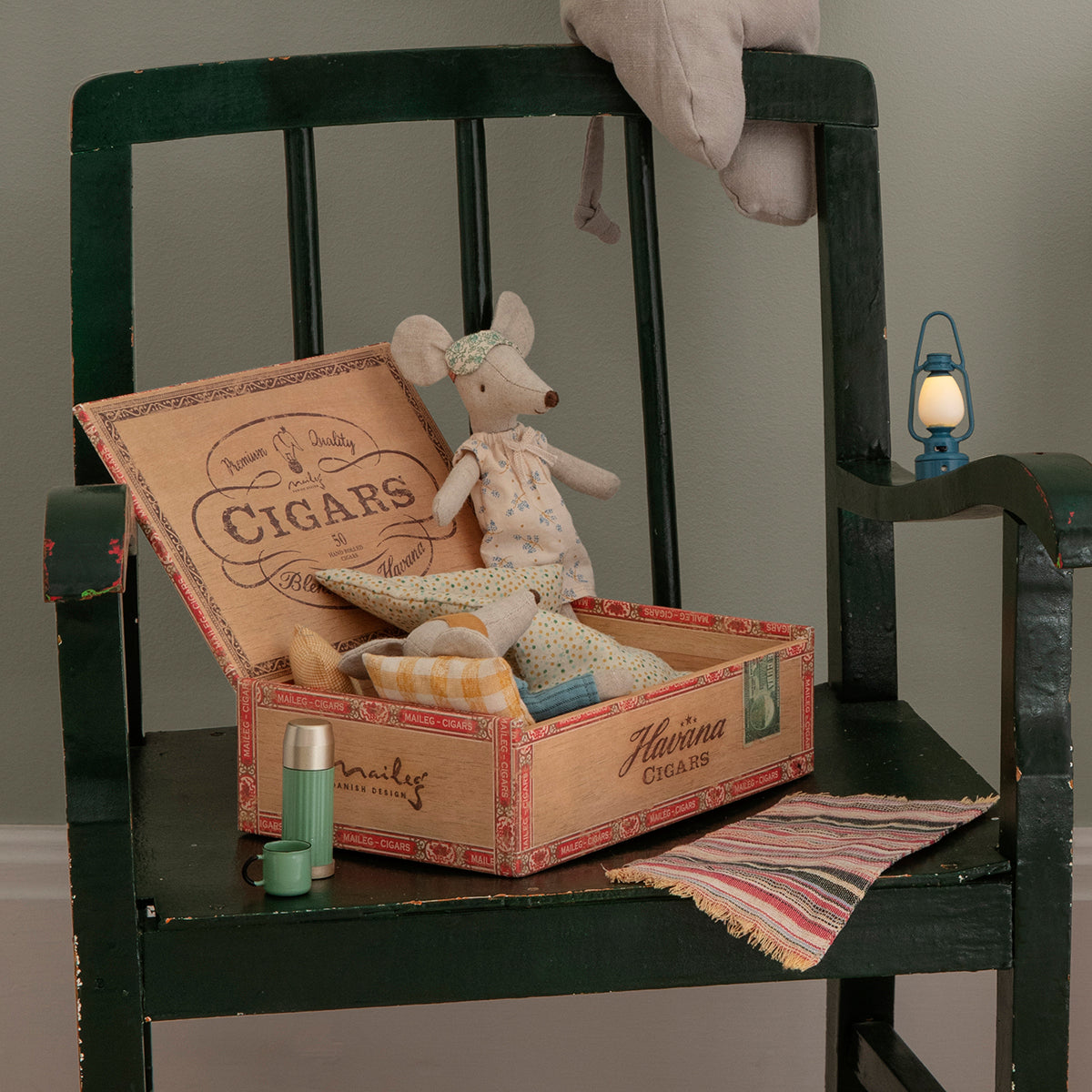 Mum and Dad Mice in Cigarbox by Maileg. A classic Maileg item. Mum and Dad mice are wearing their beautiful nightwear and eye masks. The cigar box is a perfect bed for a good night’s sleep and sweet dreams. Bed linen may vary in colour.