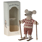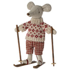 Winter Mouse with Ski Set by Maileg. A mouse ready for hours of fun on the slopes during the cold wintertime. Each playset contains a warmly dressed mouse with a pair of ski and poles. A funny detail is the ears which are made so they look like the mouse is wearing ear warmers.