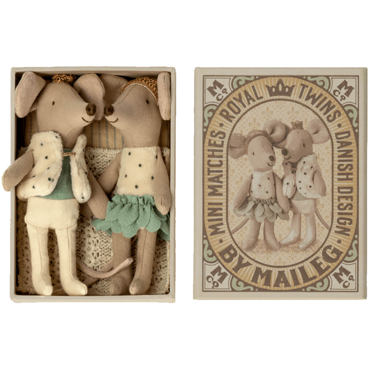 Royal Baby mice twins in a matchbox by Maileg. These royal twins cosy up together in their box to go to sleep, and keep their mum on her toes during the day. Includes a knitted blanket to keep them cosy.