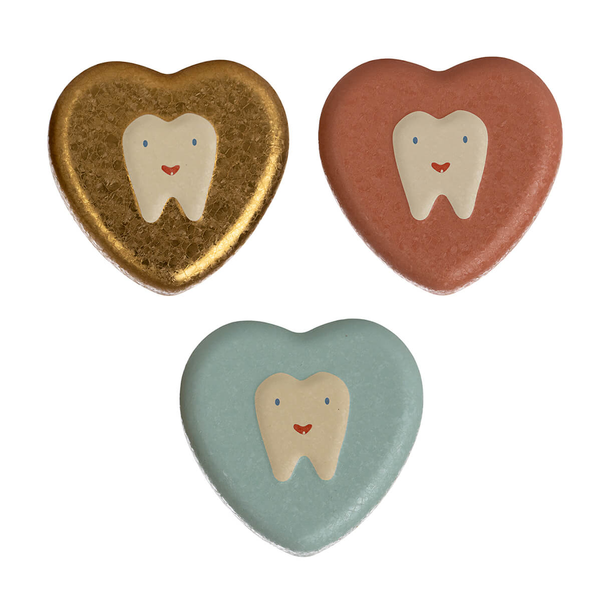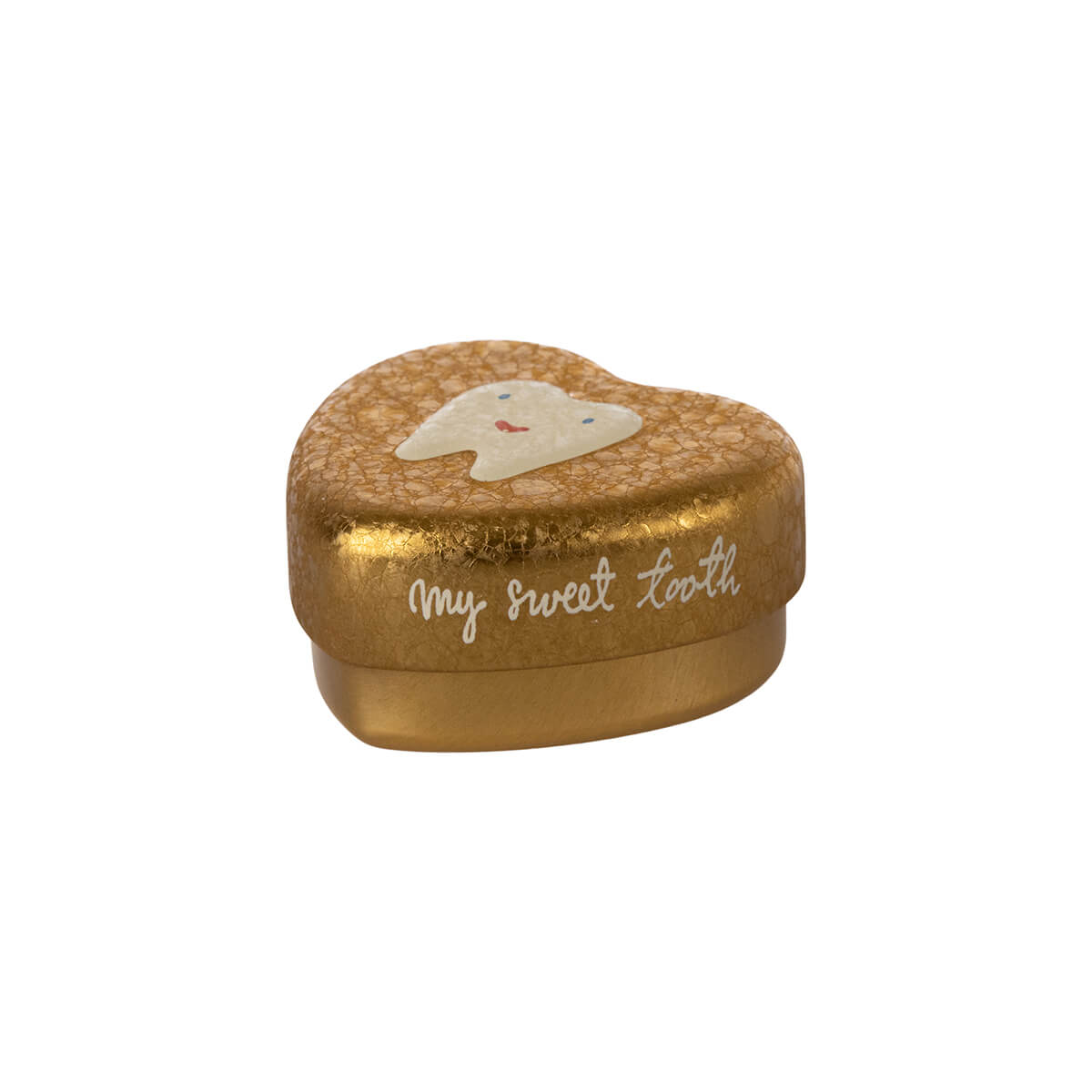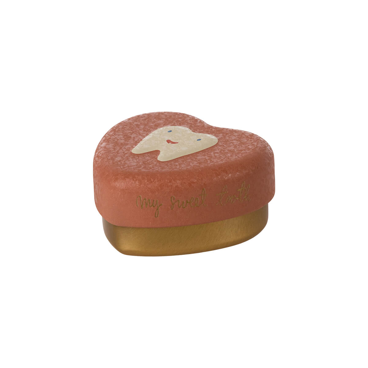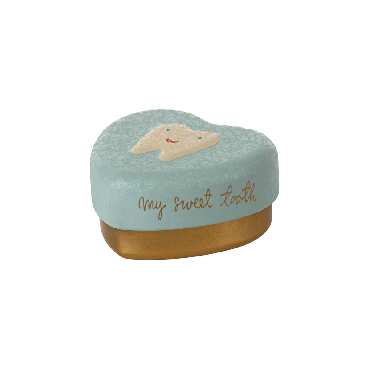 Tooth Box by Maileg. This metal heart is the perfect place to save small baby teeth to ensure childhood memories will last. The box has a lovely tooth embossment and a special crackled surface on the lid. In a choice of three colours - rose, mint and gold.