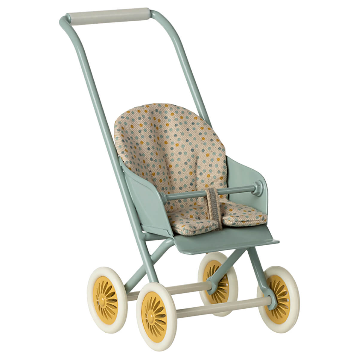 Baby mouse or bunny stroller in mint by Maileg. This cute metal stroller is mint green with a polka dot patterned cotton seat. Excellent to take a stroll through the park with your favourite Micro Maileg friends. It fits the Micro sized rabbits, mice twin babies and sleepy wakey mouse.