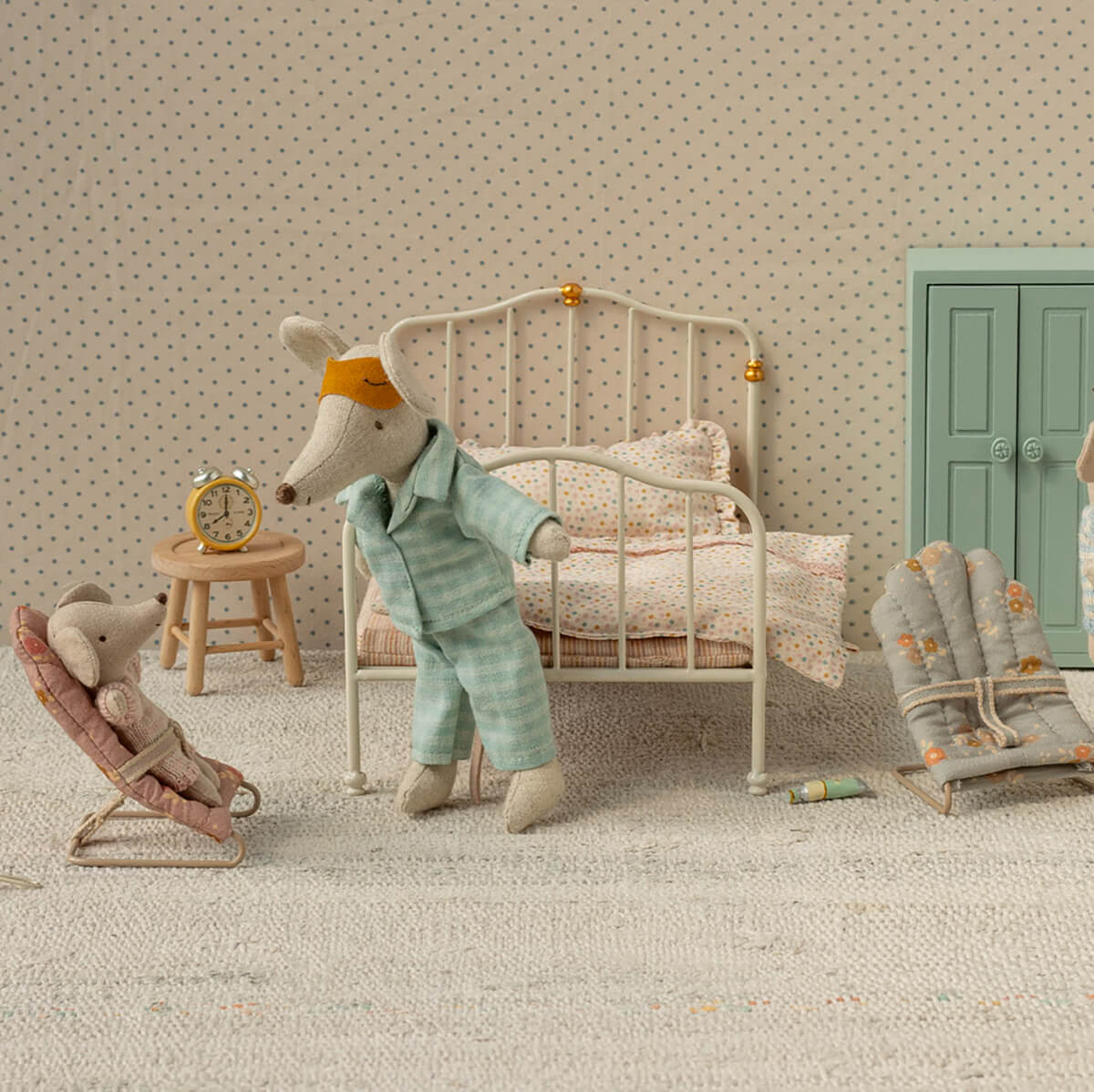 Babysitter baby mouse / bunny chair by Maileg. With this babysitter, it is easy to put your little friends to sleep. The base is made of metal and covered by the most lovely fabric. The chair fits my sized rabbits/bunnies and baby mice perfectly.