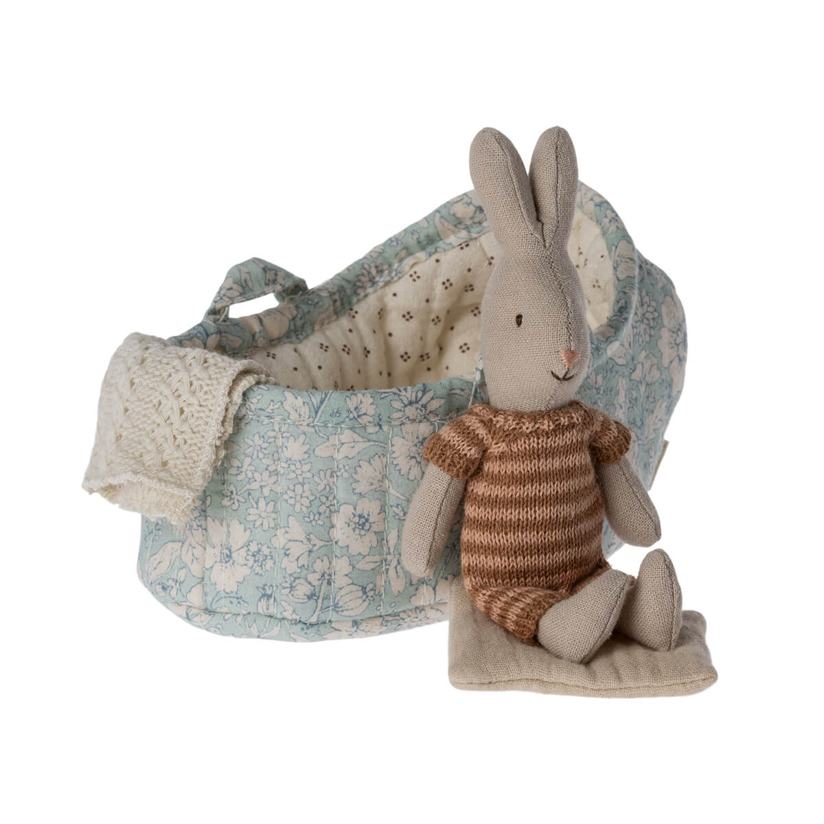 Rabbit in Carry Cot by Maileg. This playset is the perfect start to any story. A soft carry cot made in a beautiful fabric where the small bunny in colorful suit can easily be tucked for a nap, covered in the knitted blanket to keep warm.