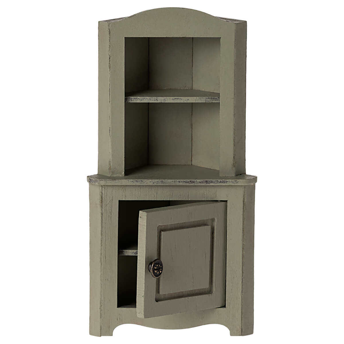 Corner cabinet for Mouse Family by Maileg.  The perfect closet to store a lot of stuff. It fits perfectly into a corner so it will look stylish in the home decoration. It has a vintage finish - variation in the paint may occur. This closet fits perfectly into the mouse hole farm house.