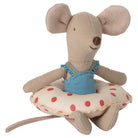 Beach mice little sister with float by Maileg. Get beach ready! Little sister mouse dressed in a blue colored swimsuit with her dot printed float around the stomach. She is now ready for a safe swim in sea.