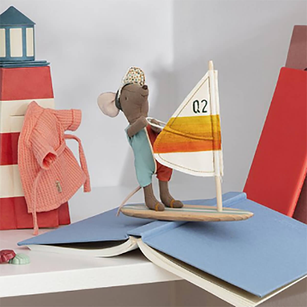 Beach Mice Surfer Big Brother by Maileg. It's vacation time! This mouse is ready for a day at the beach. He is dressed in a surf suit and brings his surfboard, and to complete the surfer look, he wears his sunshade cap - he is ready to ride the waves! The surfboard and mast are made of wood.