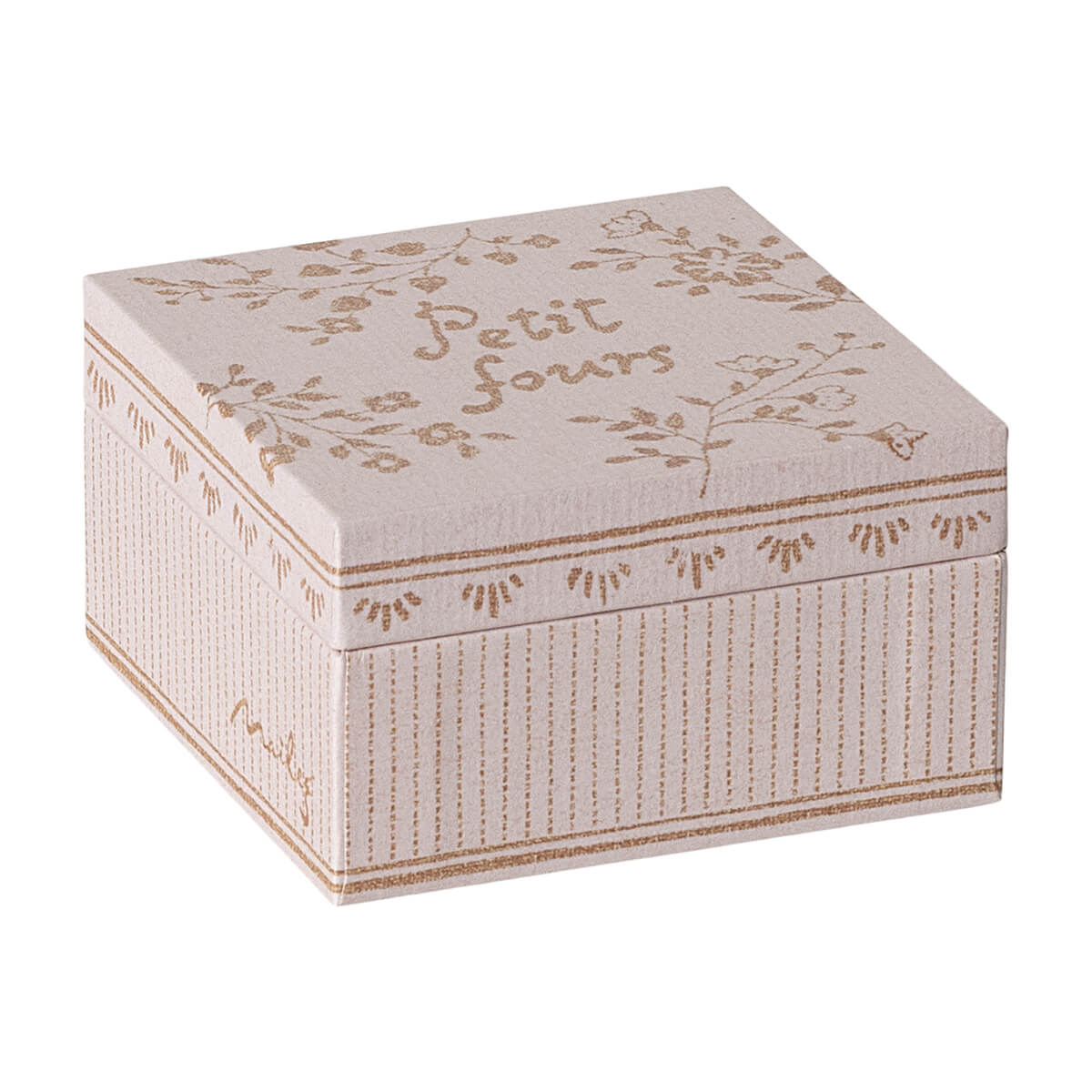Cakes and cake stand set by Maileg. This little set of 3 delicious cakes on a beautiful decorated cakestand in rose color is a must have. The cakes are thoroughly decorated by hand. The cake set is made in size mini for Teddy family and Bunny & Rabbit size 1 & 2.