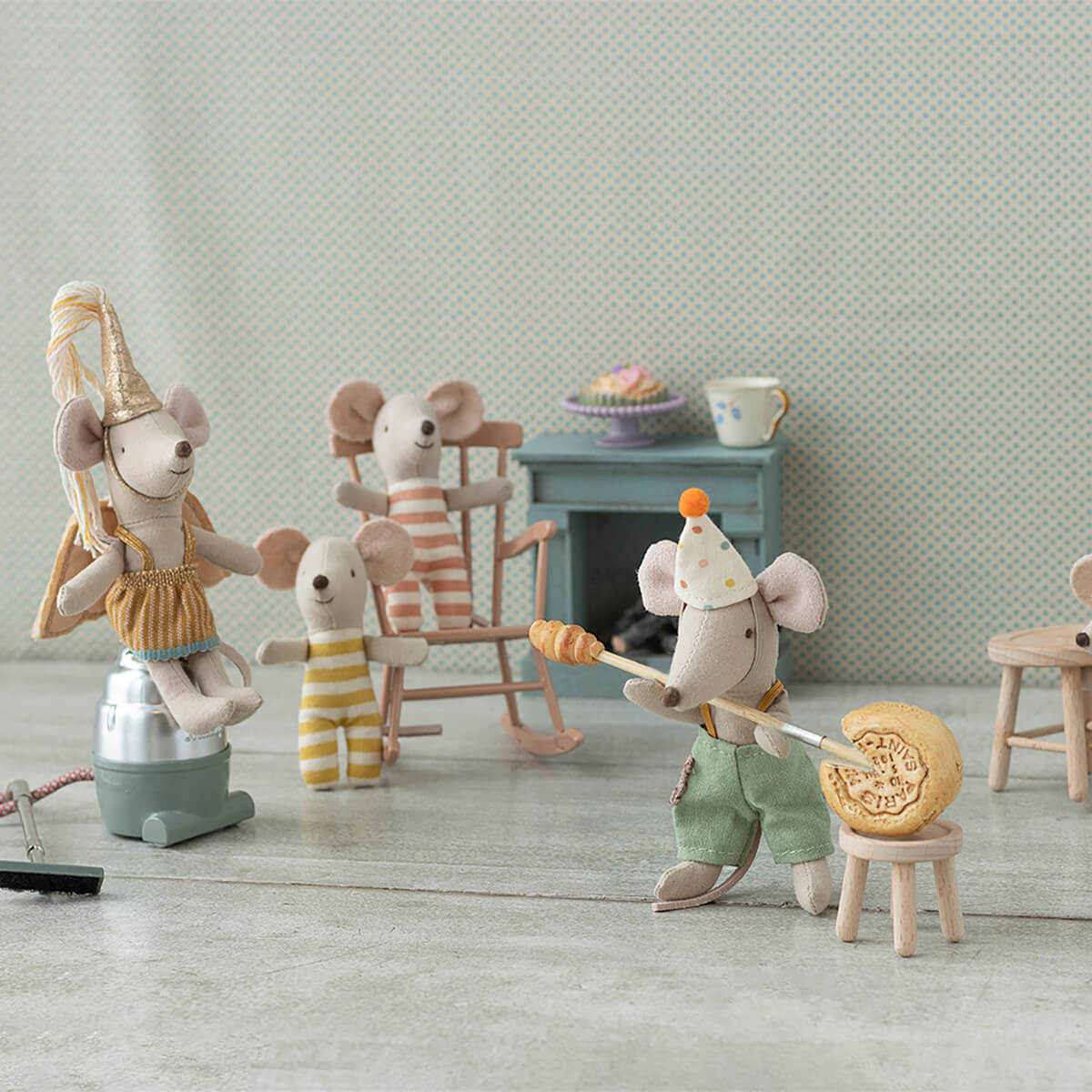 Clown clothes in suitcase for little sister mouse by Maileg. Dress up your little brother mouse in this beautiful set of clown clothes. This set includes pants with suspenders and a hat - all packed in a small metal suitcase so it is easy to bring on the go..