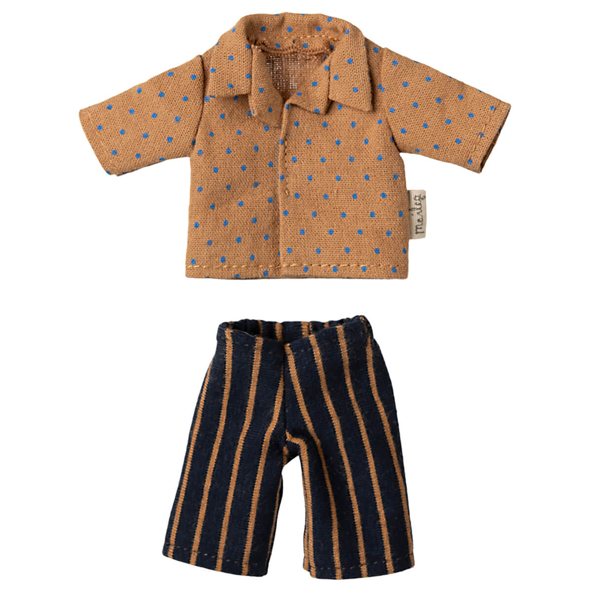 Dotty shirt and striped pants set for Dad mouse by Maileg. A loose set of clothes for a mouse in size dad / big brother. This set includes a spotty shirt and a pair of striped trousers. Fits Dad and Big Brother mice.