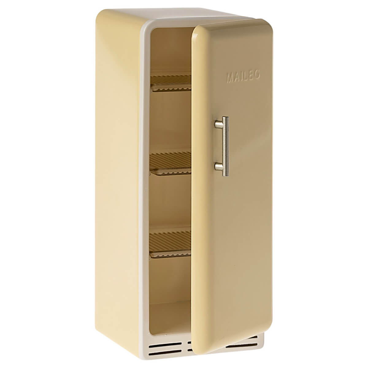 Fridge in yellow by Maileg. An old fashioned fridge that fits perfectly into the House of miniature dollhouse. The fridge is made in metal with magnetic lock and frosted shelves inside. (Food not included)