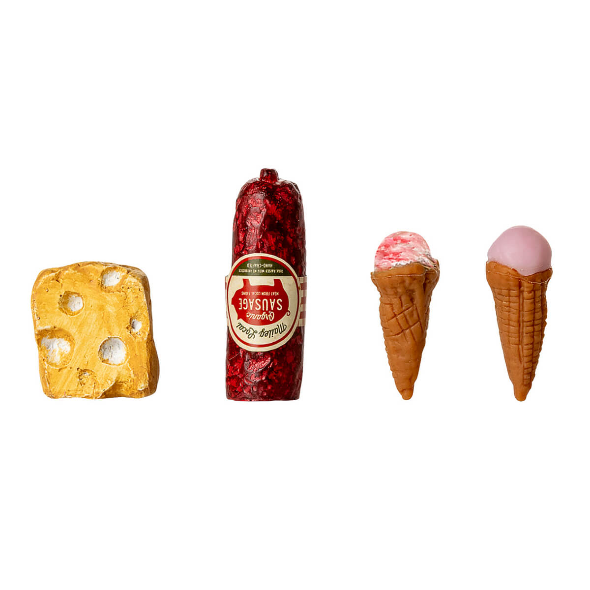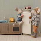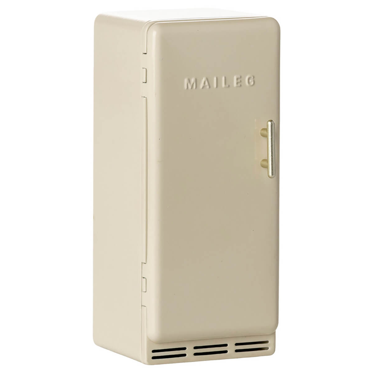 Mouse fridge in off-white by Maileg. An old fashioned fridge that fits perfectly into the Maileg Mouse hole Farmhouse. Inside the fridge you will find a small cheese, sauage and some ice creams. These will extend the storytelling and play.