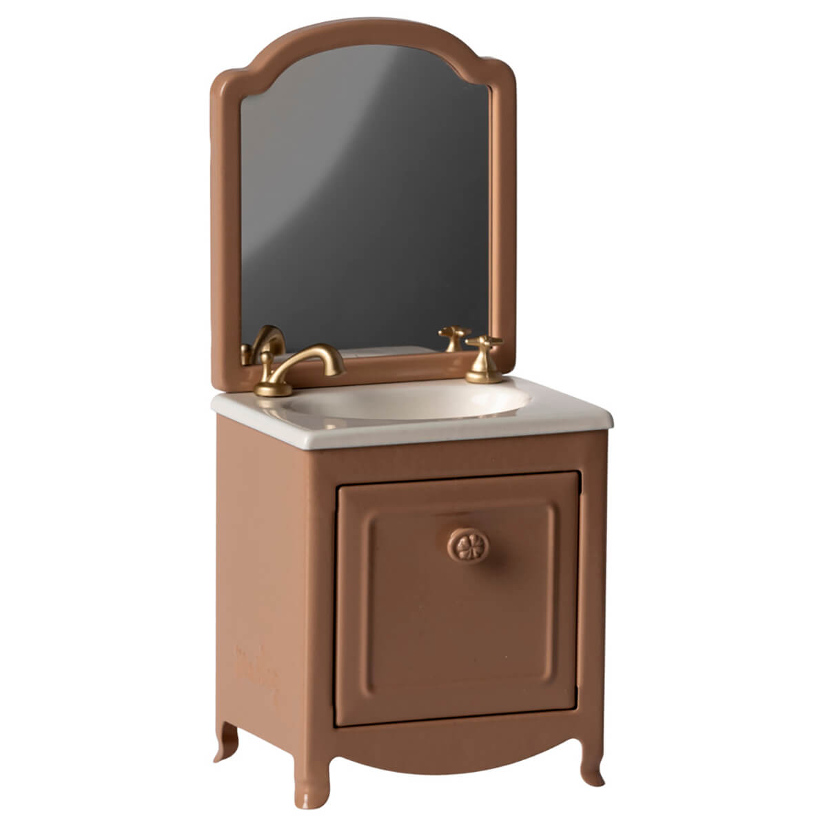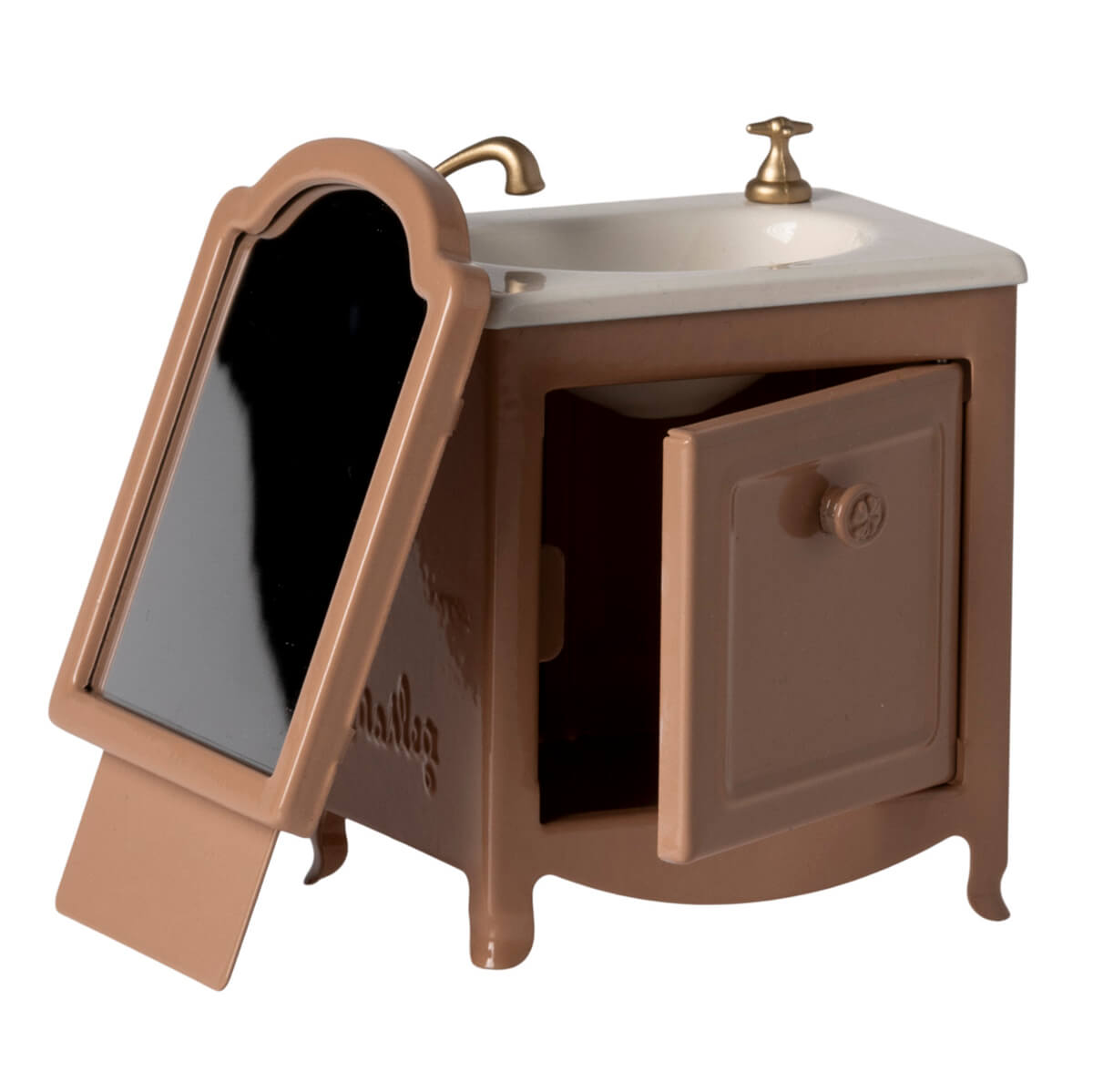 Sink dresser with mirror for Mouse Family by Maileg. A very essential item for the the bathroom in any mouse house. It has a small closet under the sink and of course a mirror as well. Add the Maileg toilet and bathtub to extend the play.