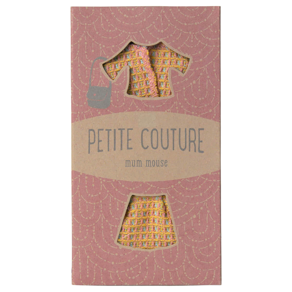 Suit in yellow check for Mum mouse by Maileg. When mum mouse has somewhere important to be, this is the outfit for her. The suit is a short jacket and skirt plus a stylish handbag. Fits Mum and Big Sister mice.