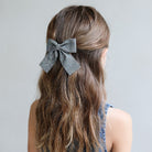 Hand tied silver glitter fabric bow secured to a barrette clip.