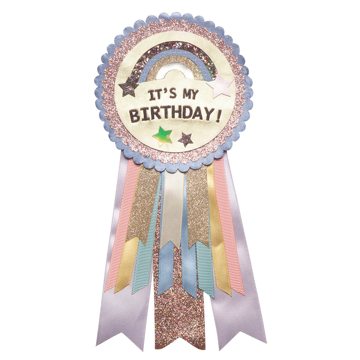 It's My Birthday rosette brooch by Mimi & Lula. Hip, hip, hooray! Your little one will feel extra special on their big day with this fabulous 'It's my Birthday' rosette. Better yet, it can be used again and again, year after year. Features a shimmering appliqué rainbow and stars atop layers of scalloped trim glitter and metallic leatherette fabric. Finished with layers of satin, grosgrain and glitter ribbons in an array of rainbow colours.