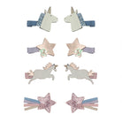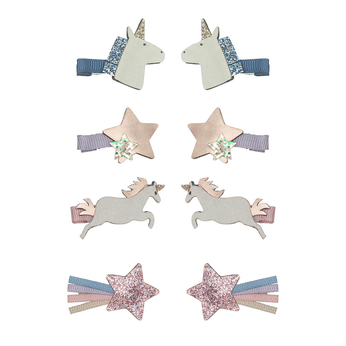 Unicorn Hair Clips by Mimi & Lula. Make their hair dreams come true with these magical unicorn mini clips. Oh so pretty and super sparkly too, these clips are perfectly proportioned for keeping little manes tidy! Featuring unicorns and stars crafted from a combination of soft suedette, glitter and metallic fabrics.