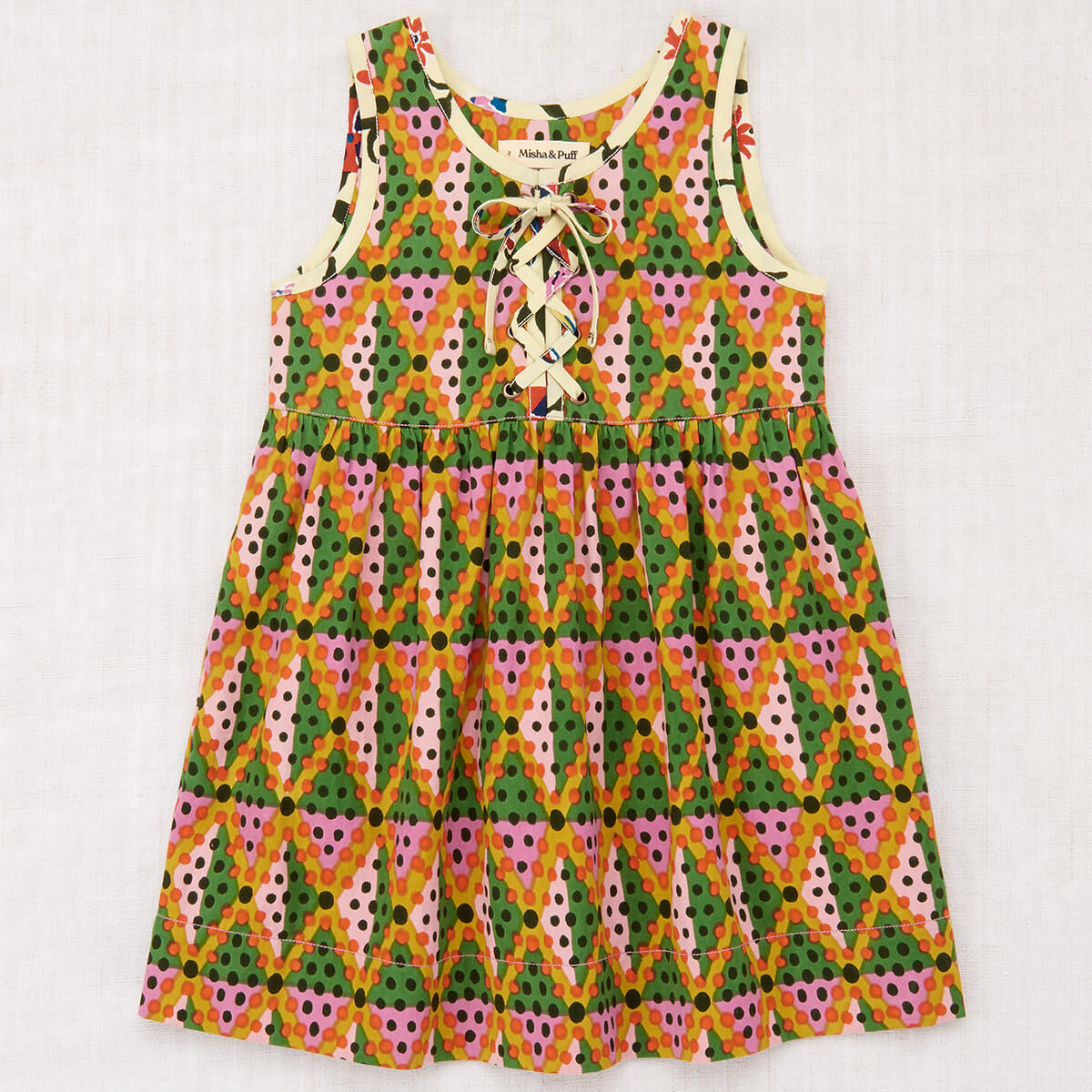 Agatha Dress by Misha & Puff. A sleeveless dress in cotton twill, featuring a slight A-line silhouette, contrast print trim, and a grommeted lace-up tie closure with a bow. Finished with French seams.