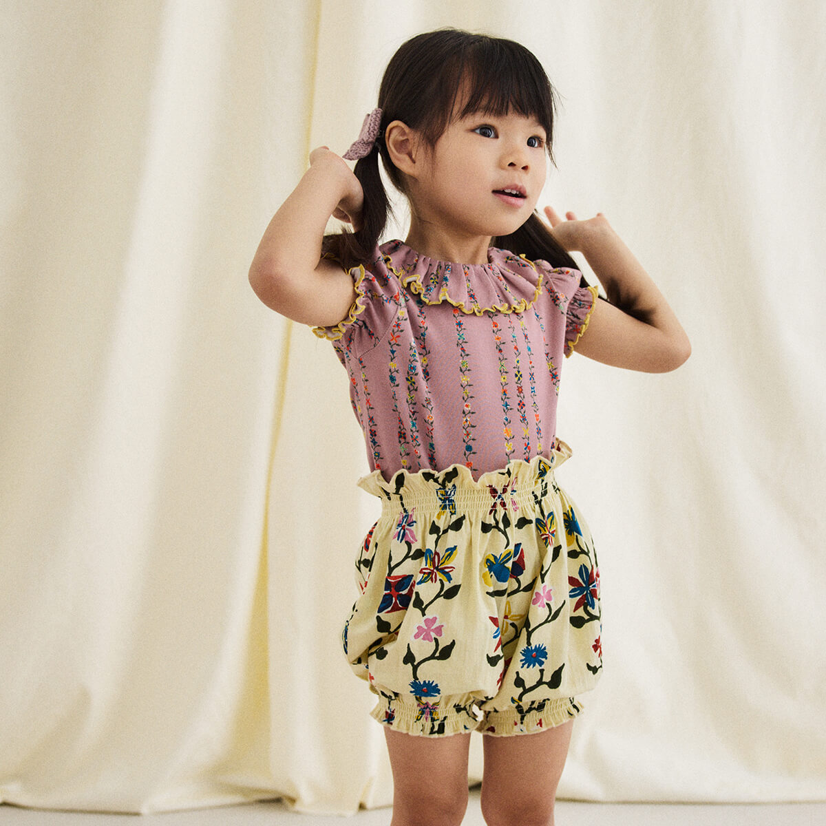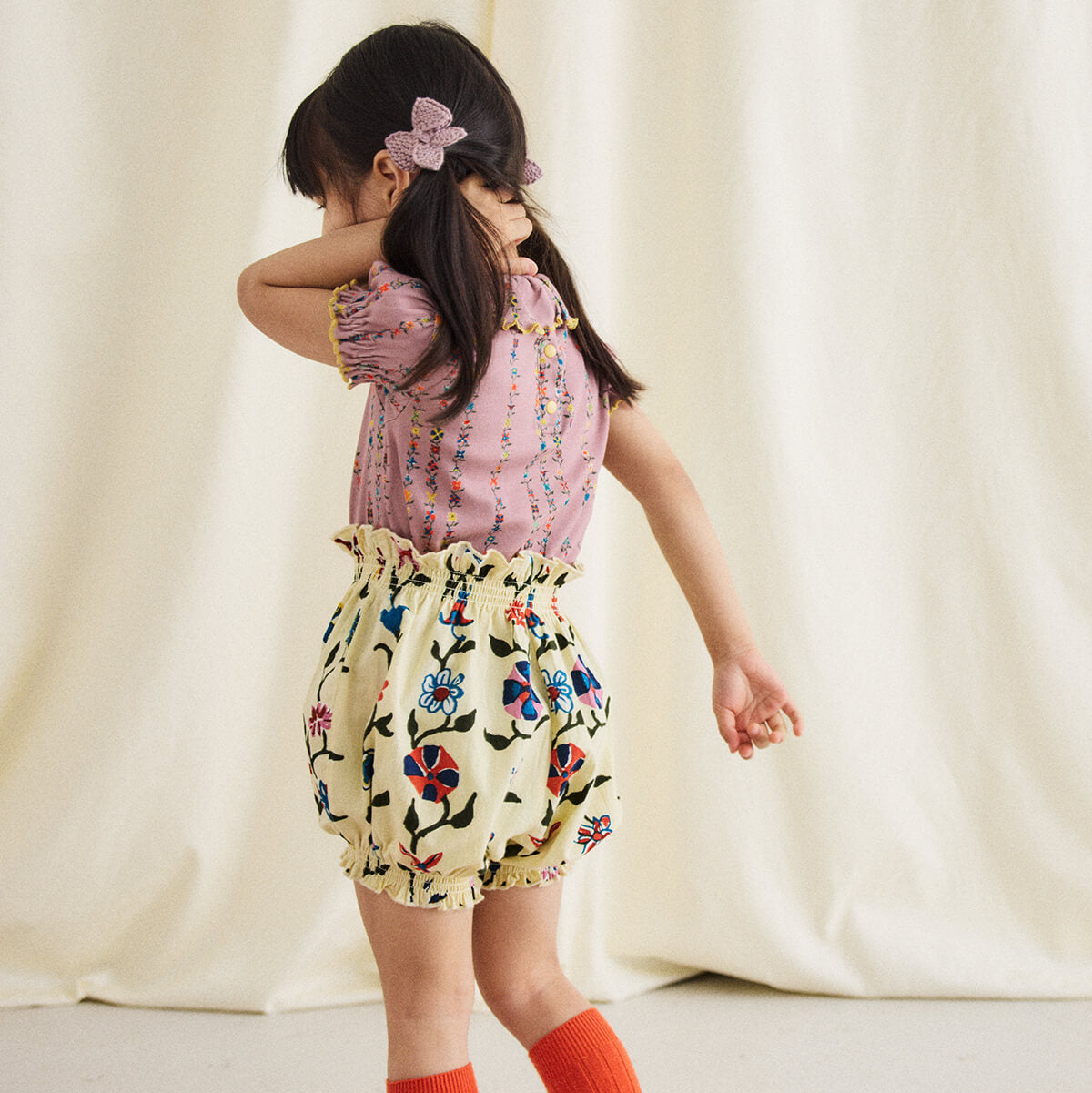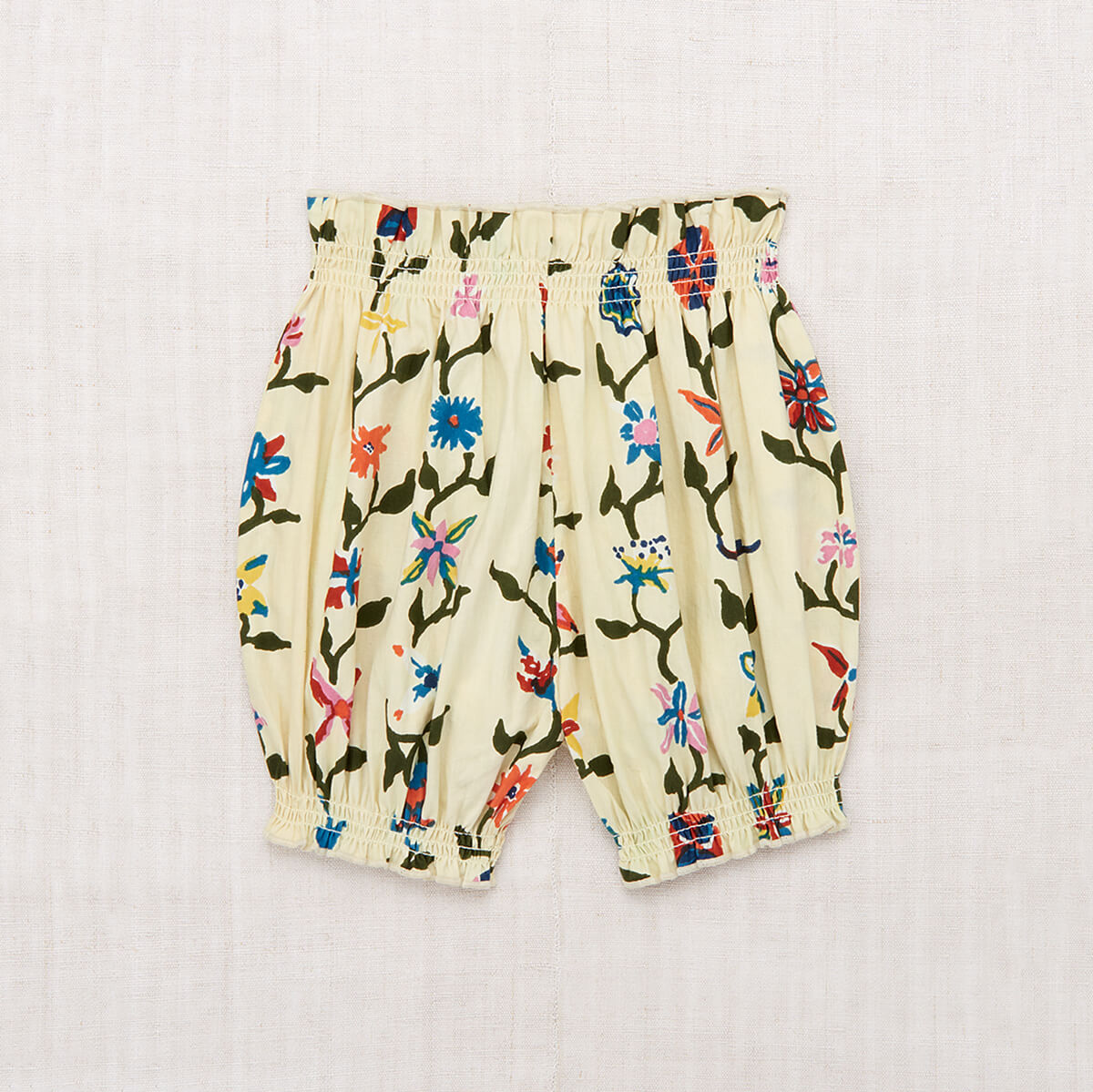 Bloomer by Misha & Puff. Pull-on bloomers in cotton poplin, with a cinched ruffle elastic waist and leg opening with a merrowed edge. Finished with French seams.