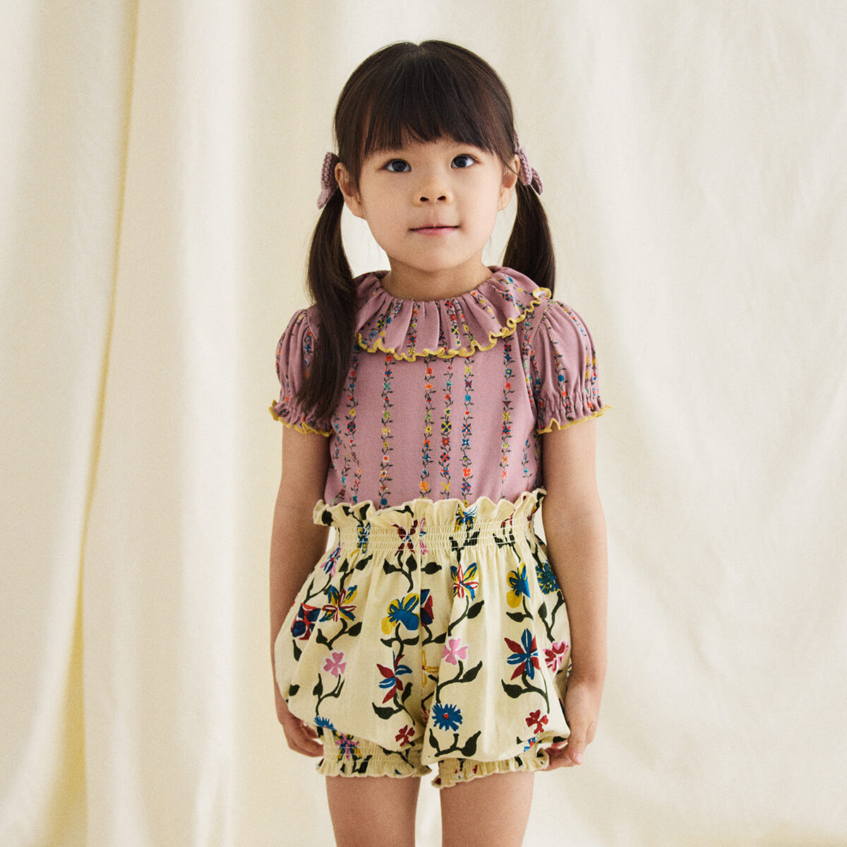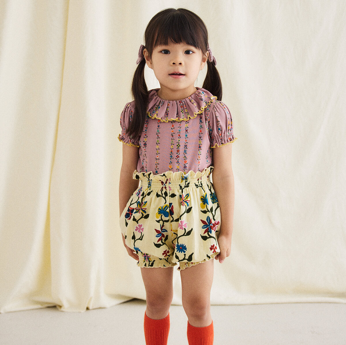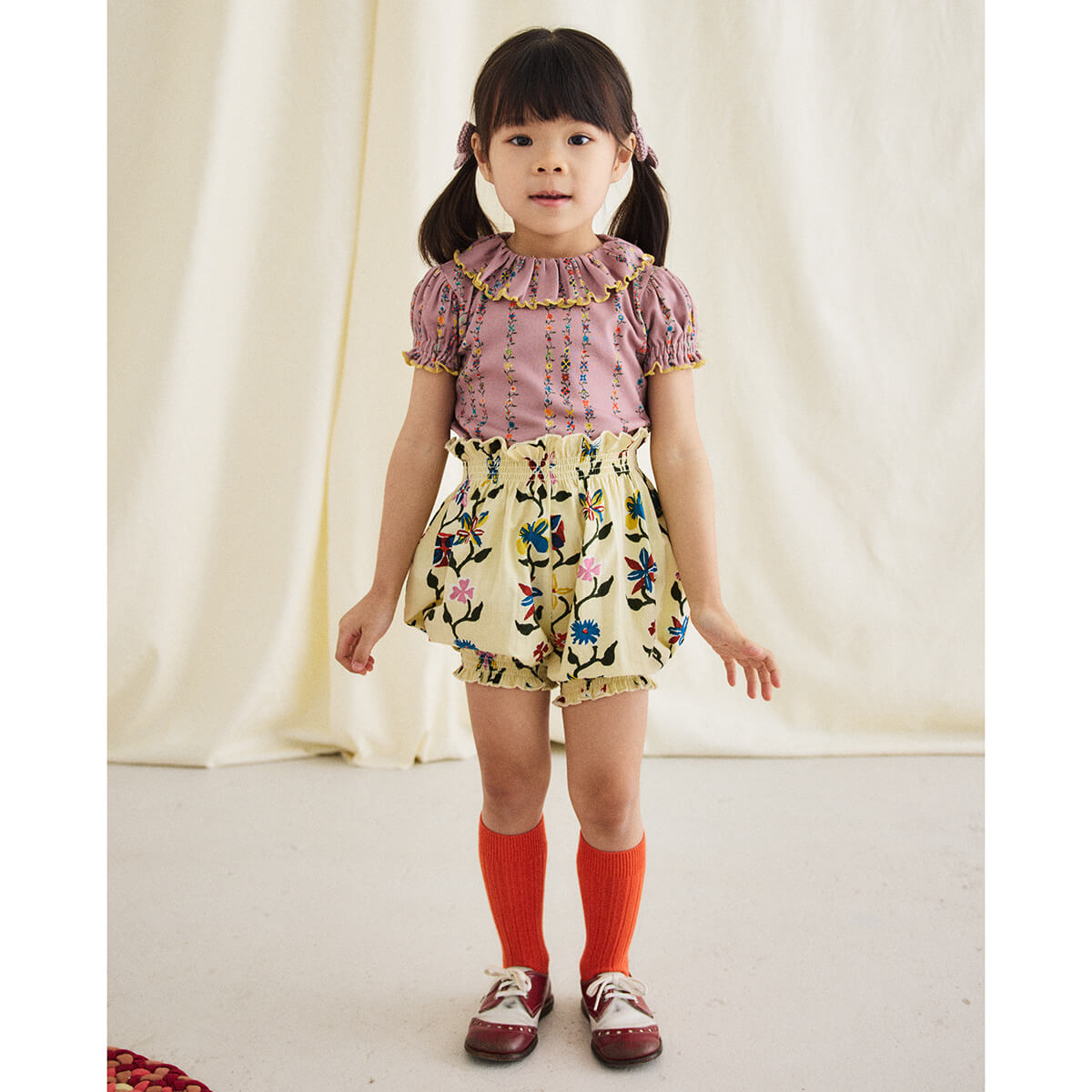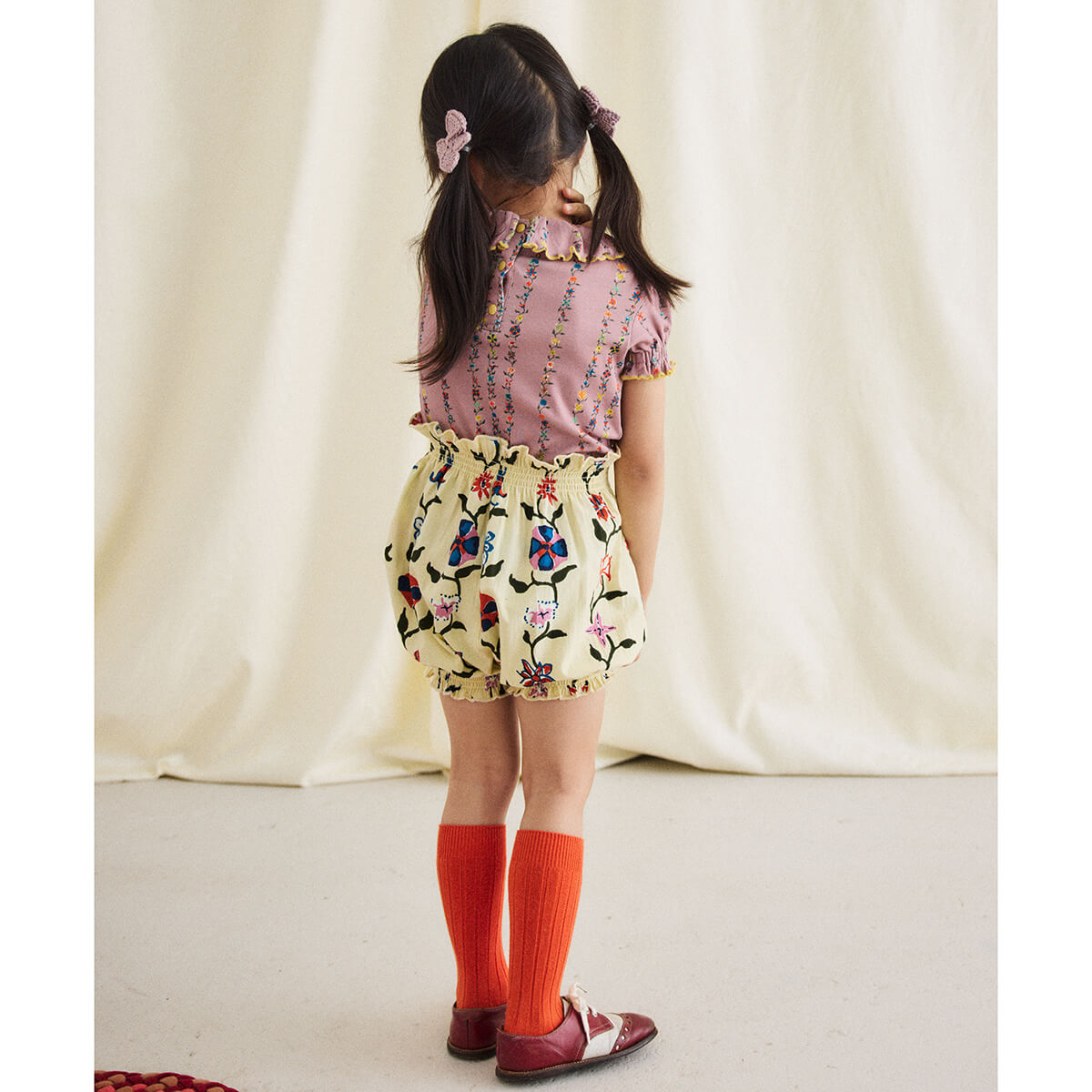 Bloomer by Misha & Puff. Pull-on bloomers in cotton poplin, with a cinched ruffle elastic waist and leg opening with a merrowed edge. Finished with French seams.