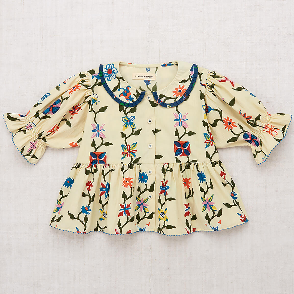 Esther Top by Misha & Puff. A peplum top in cotton poplin, featuring mid-length blouson sleeves with a ruffle cuff, rounded collar with contrast trim, embroidered dot stitch detail at the cuffs and hem, and corozo button closure down the front. Finished with French seams.
