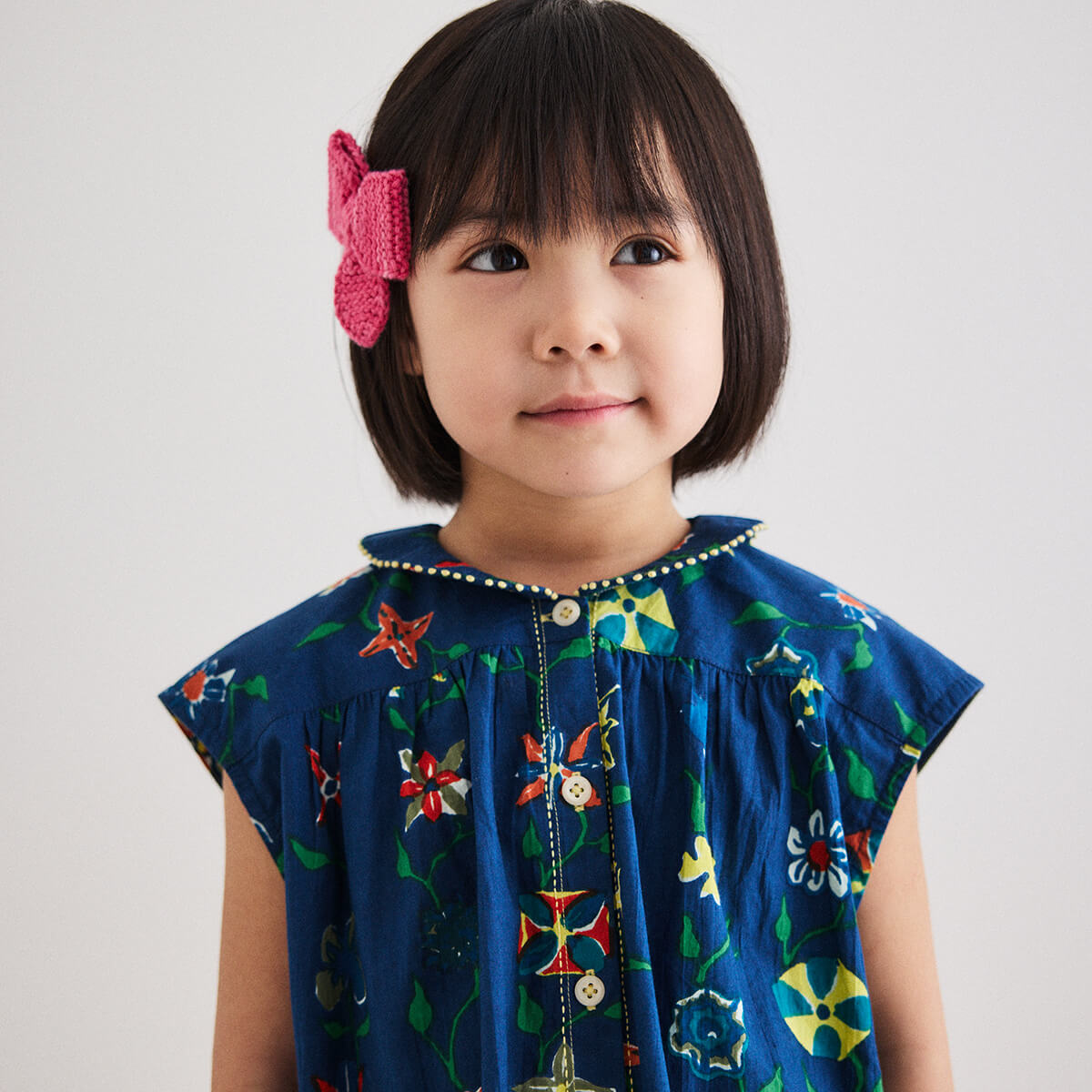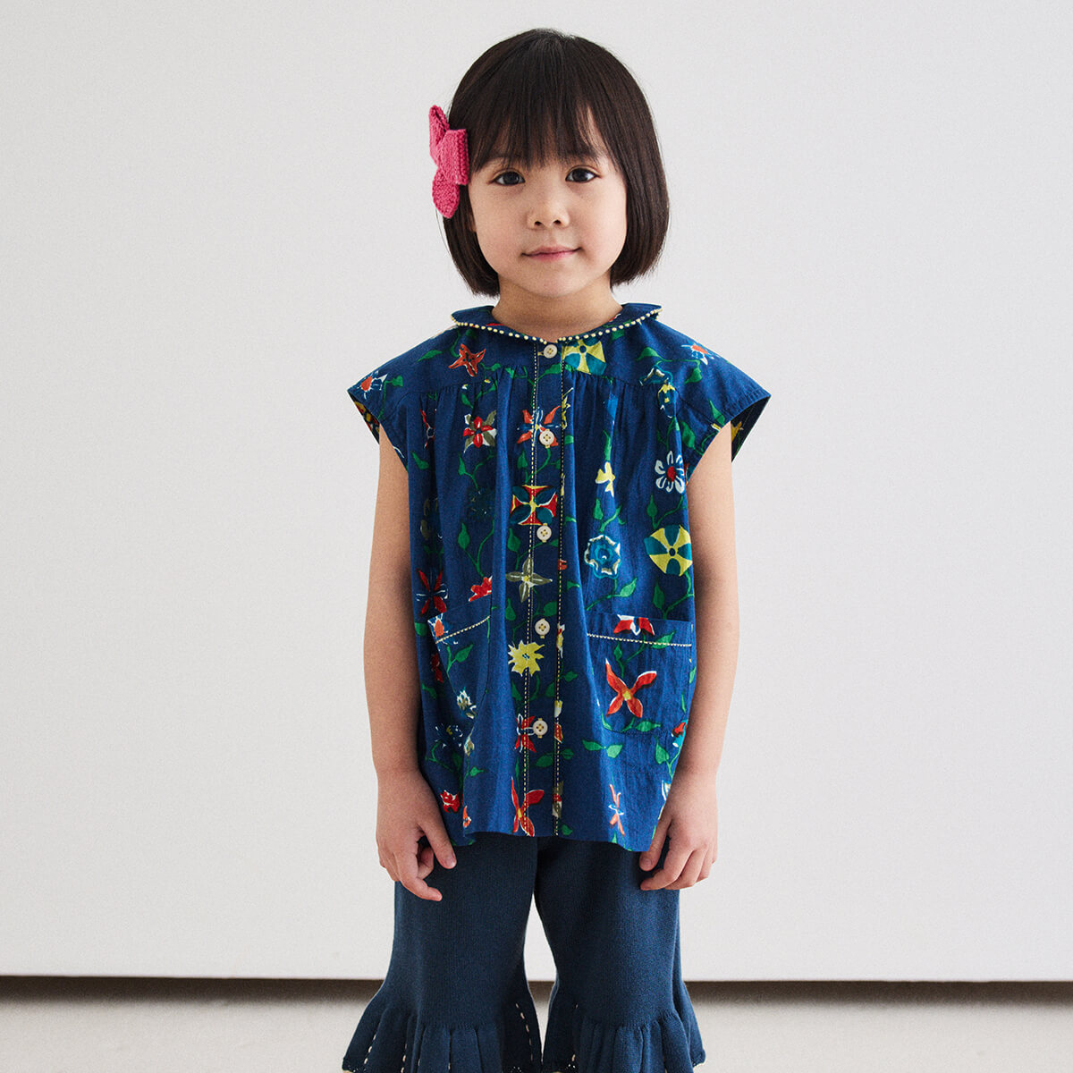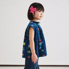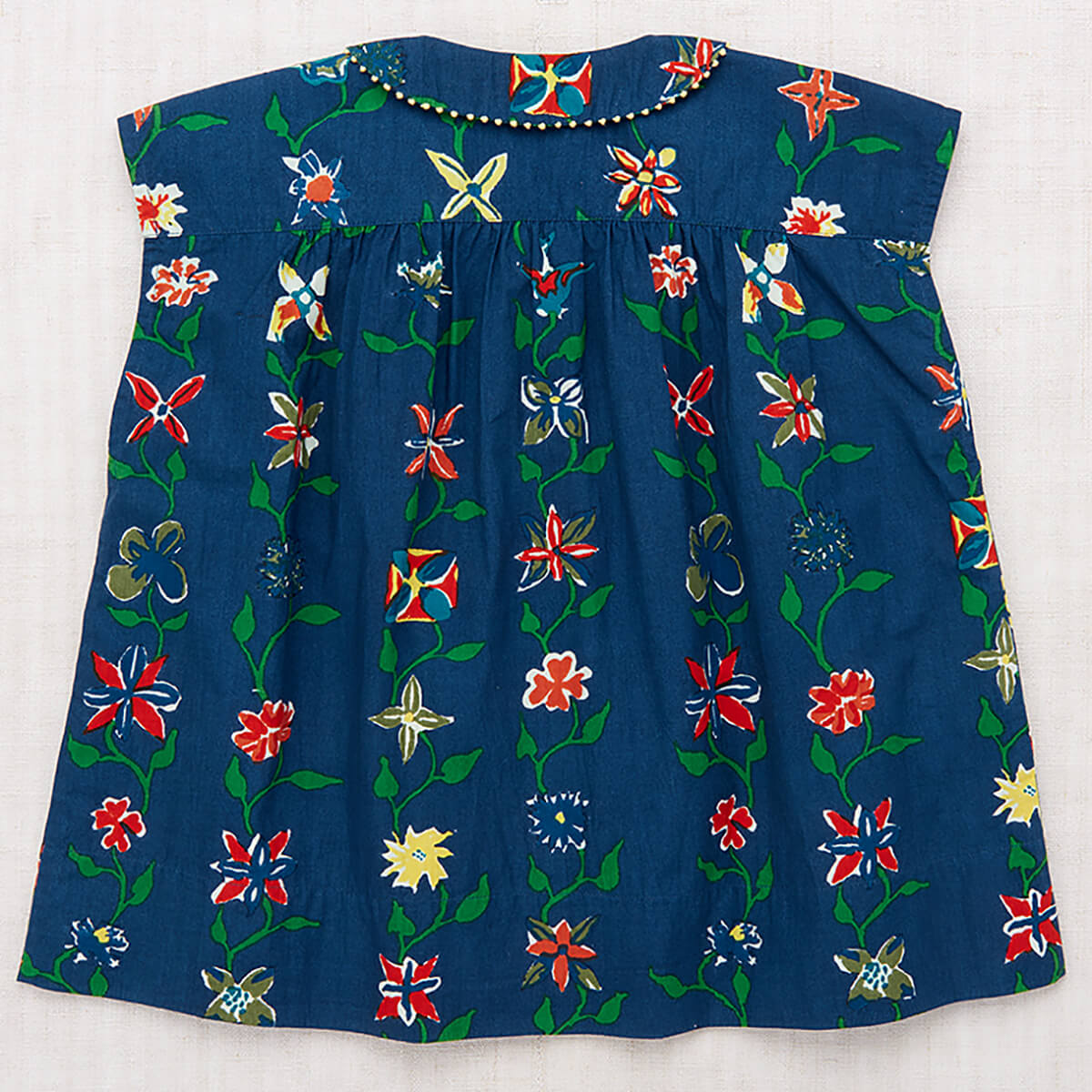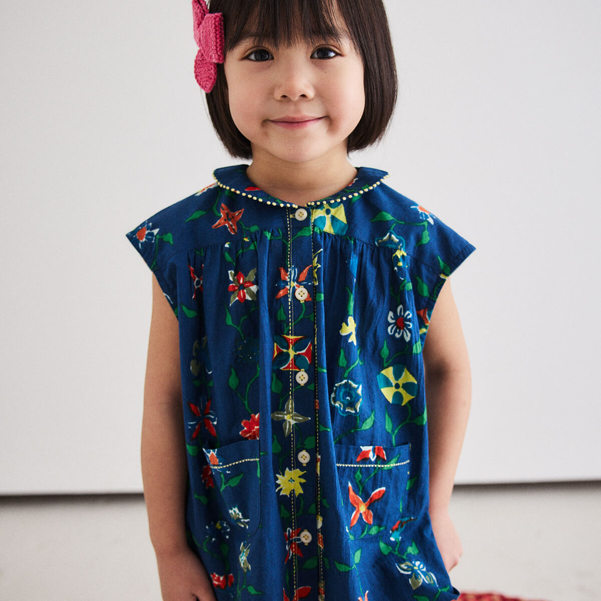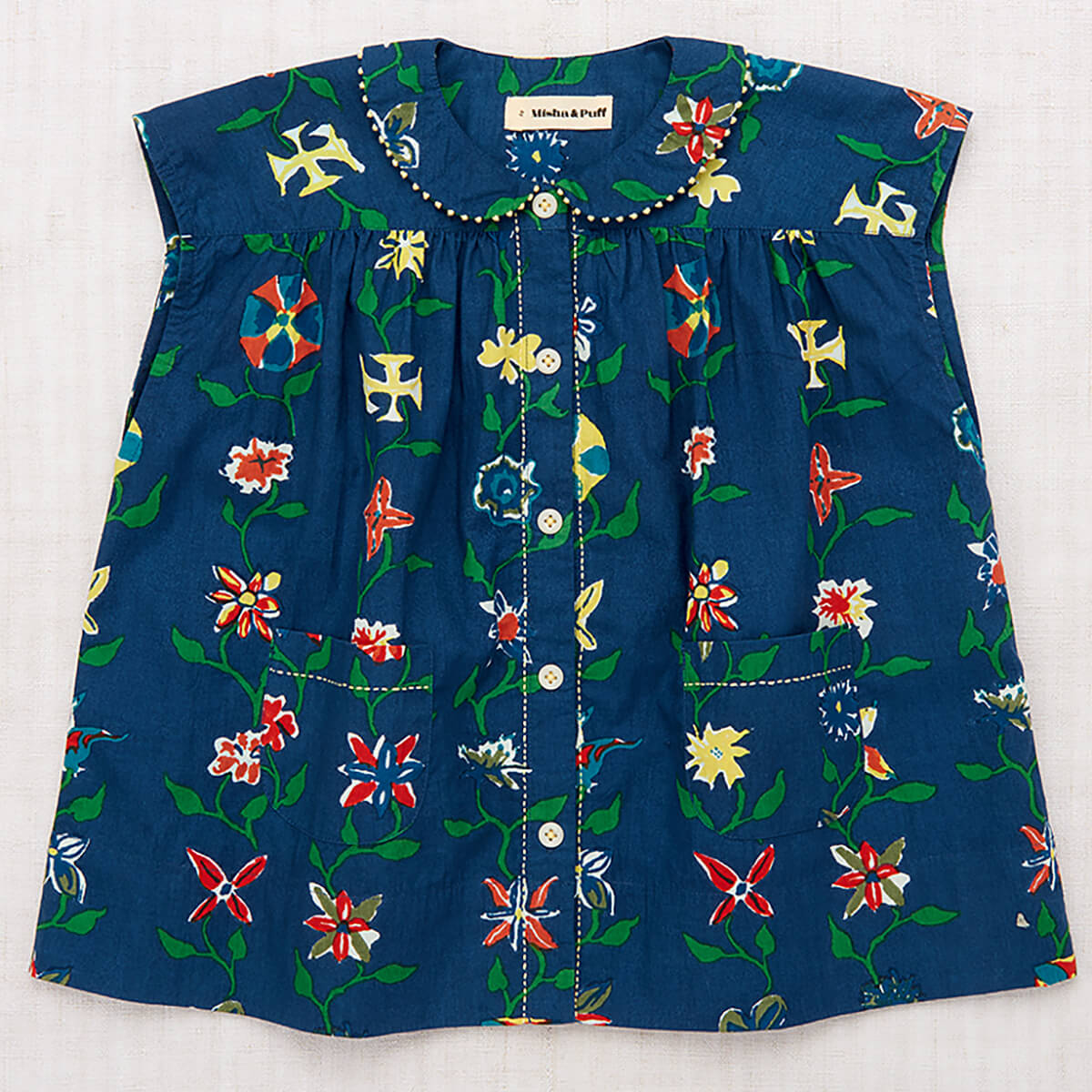 Nanna Tunic by Misha & Puff. A sleeveless tunic in cotton poplin, featuring a gathered yoke, rounded collar with embroidered dot stitch detail, patch pockets, and corozo button closure. Finished with French seams.