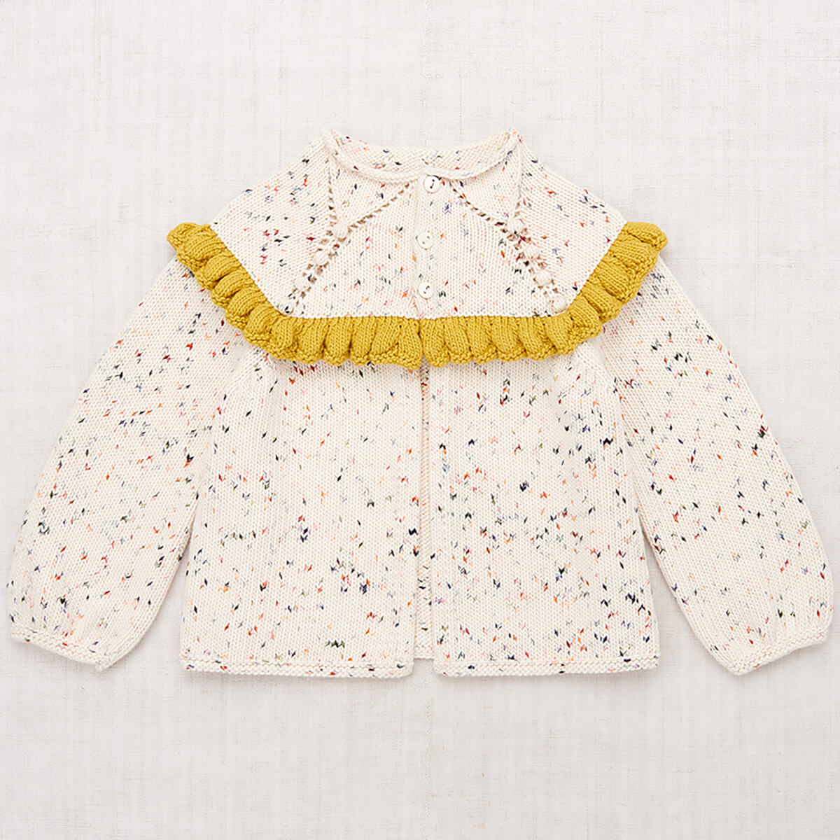 Ruffle Cardigan by Misha & Puff. A three-button cardigan in Pima cotton, featuring a self-rolled mock neck, open A-line silhouette, hand-knit yoke, and a ruffle that extends the full length of the top. With eyelet and popcorn stitch detailing, bracelet-length sleeves, garter stitch cuffs and hem, and horn button closure.