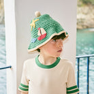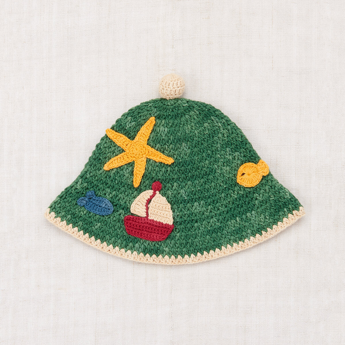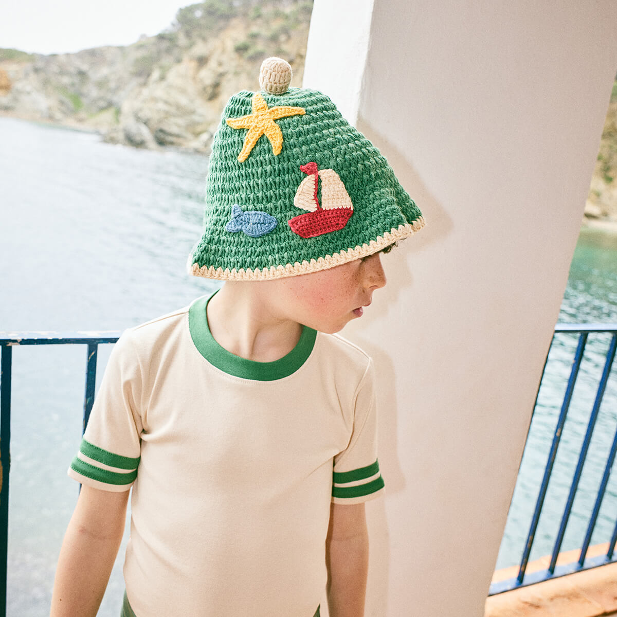 Seaside Beach Hat by Misha & Puff. A hand-crocheted beach sun hat in Pima cotton, featuring a short brim, contrast trim, and a '60s-inspired design, finished with appliqué graphic seaside details.
