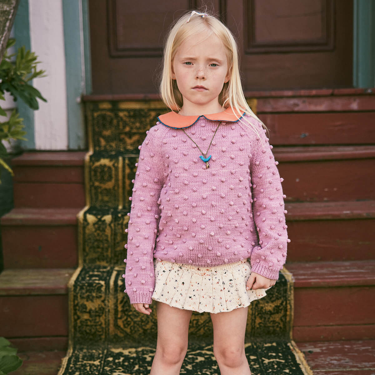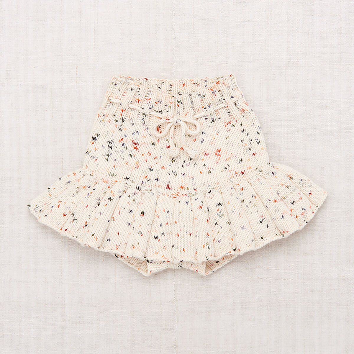Skating Pond Skirt by Misha & Puff. A hand-knit skirt in Pima cotton, featuring attached bloomers with ribbed cuffs and a ribbed waistband with a popcorn tie drawstring for a secure fit.