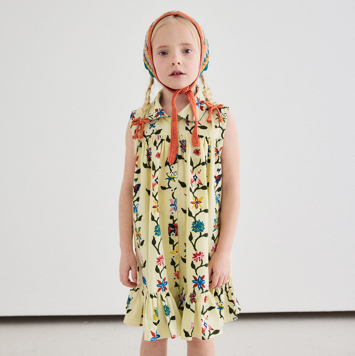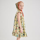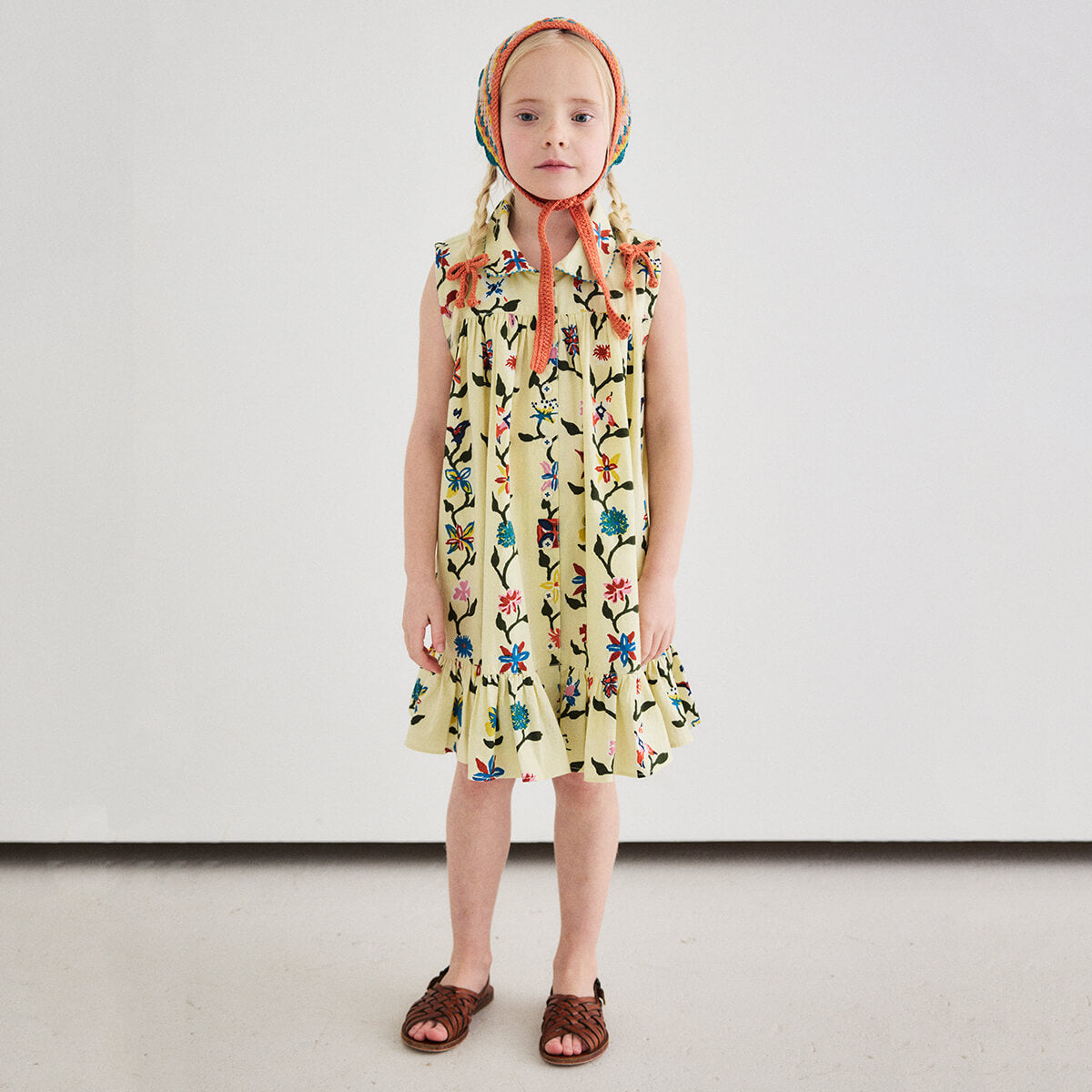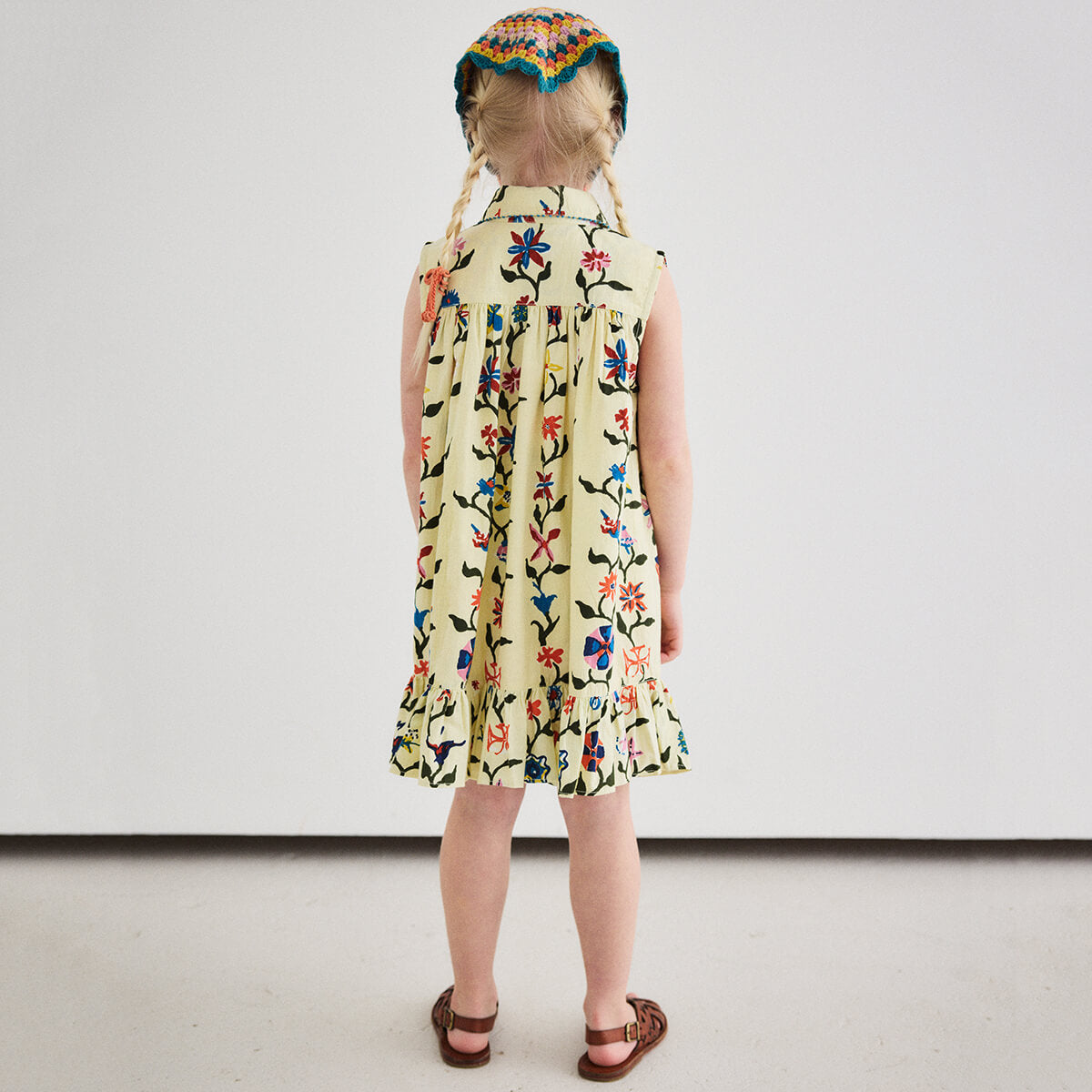 Yelena Dress by Misha & Puff. A sleeveless dress in cotton poplin, featuring a gathered yoke, rounded collar, ruffled hem, corozo button closure, and dotted trim detail. Finished with French seams.