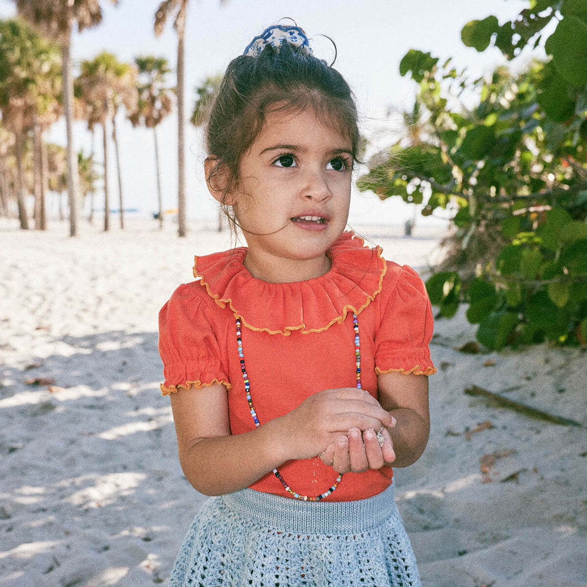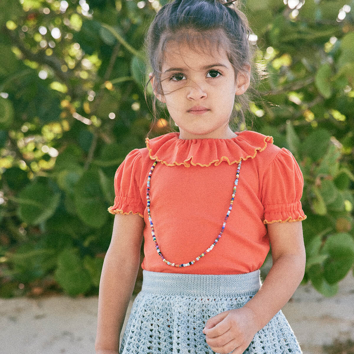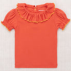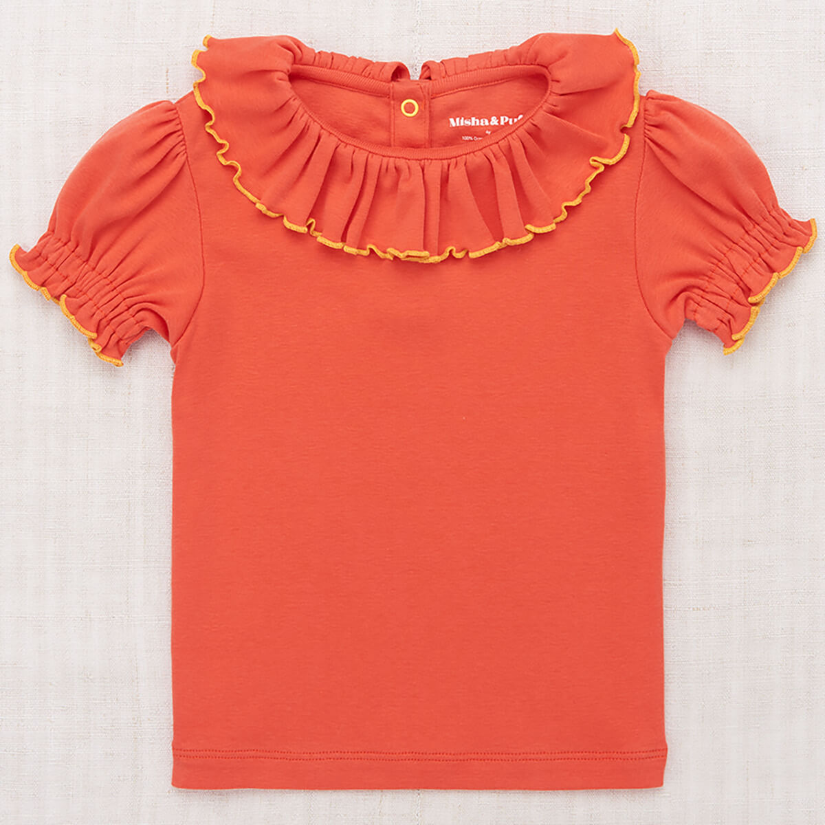 Balloon Sleeve Paloma Tee in Persimmon by Misha & Puff. A classic slim-fit puff-sleeve tee in soft Pima cotton, with a gathered ruffle neck and covered elastic ruffle cuff with a contrast merrowed edge, and snap closure at the back neck.