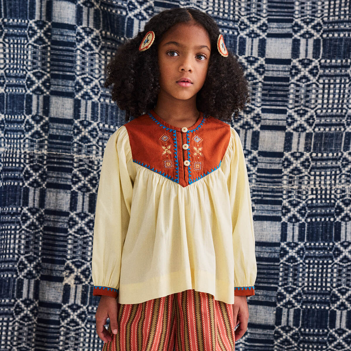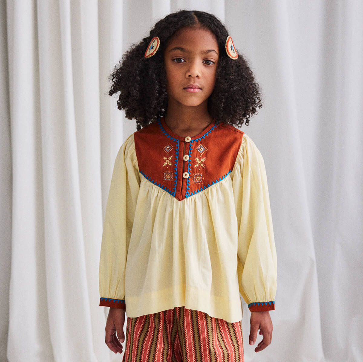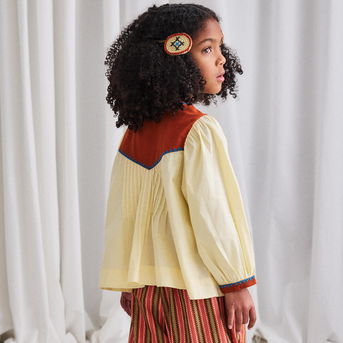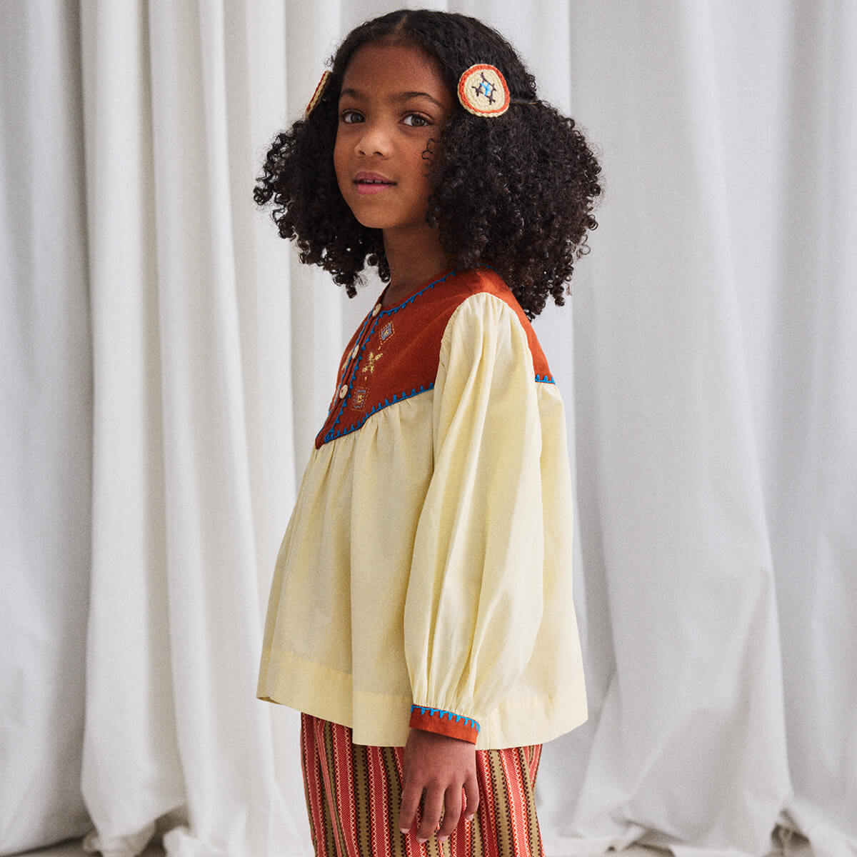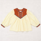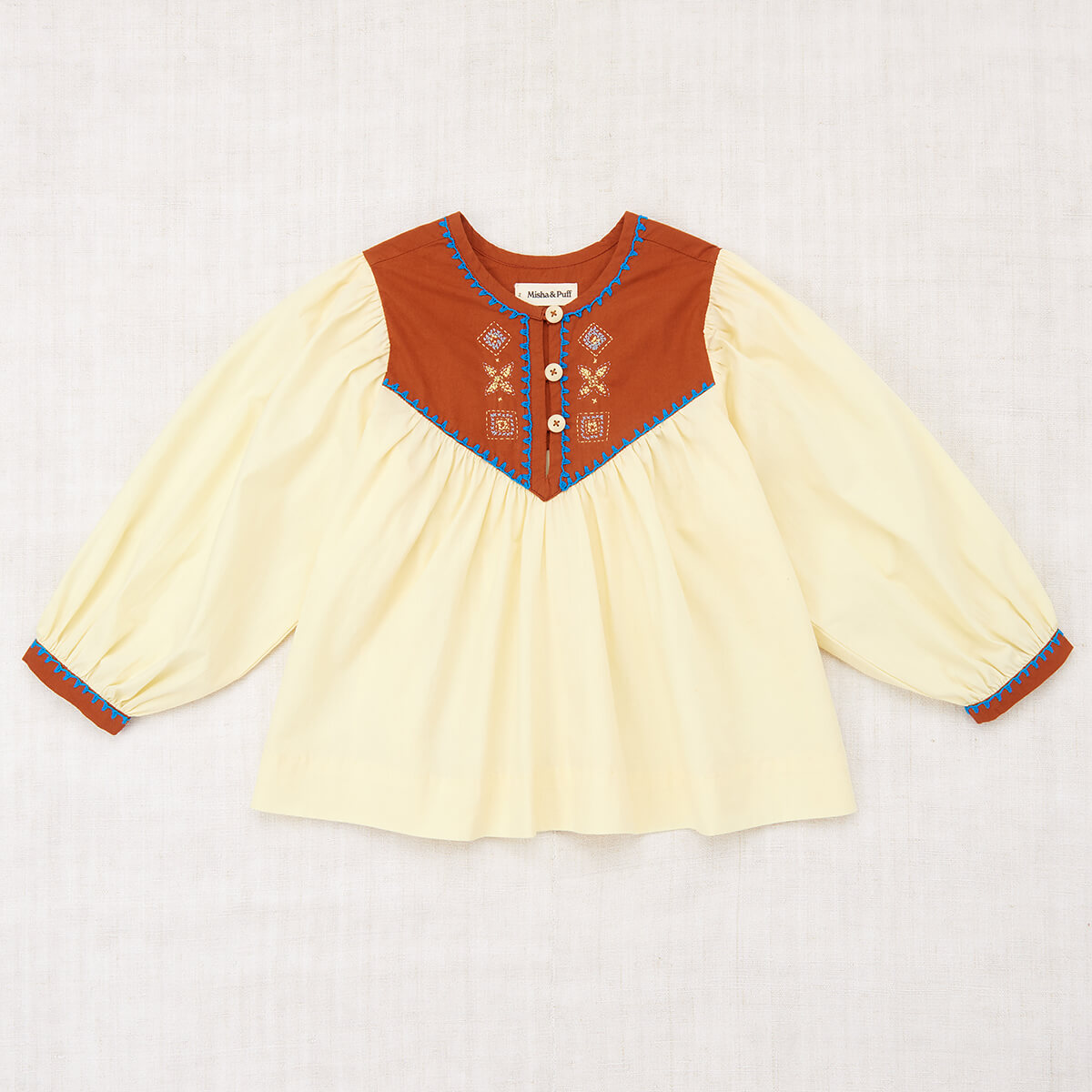 Betina Top by Misha & Puff. A pullover top in cotton poplin, featuring a gathered yoke, balloon sleeves with cuffed hems, and corozo button closure. Finished with hand-embroidered trim and French seams.