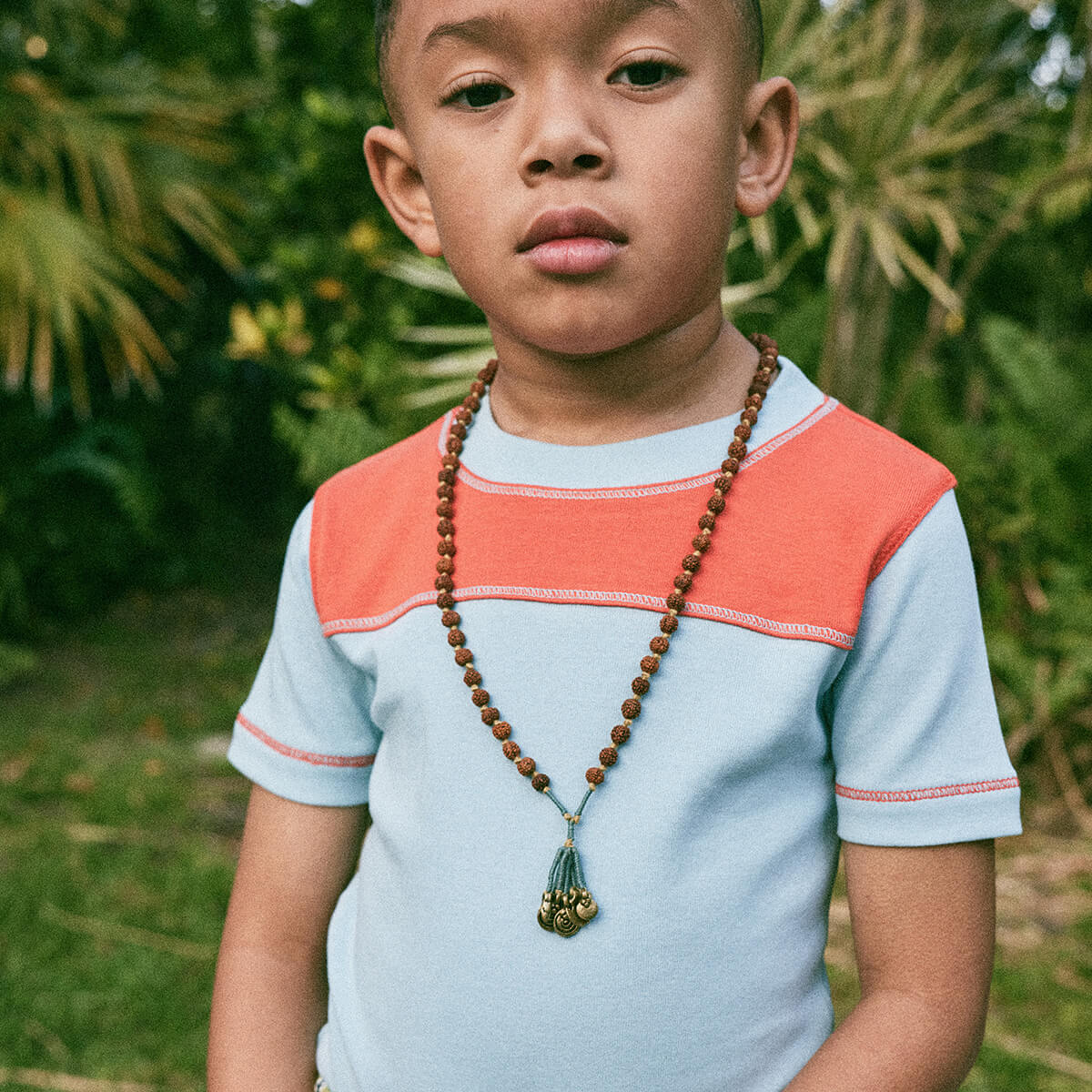 Bleacher Colourblock Tee in Sky by Misha & Puff. A classic straight-silhouette tee in soft Pima cotton, with a contrast yoke, and contrast chainstitch topstitching.