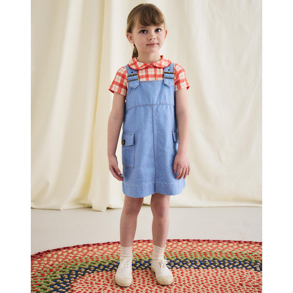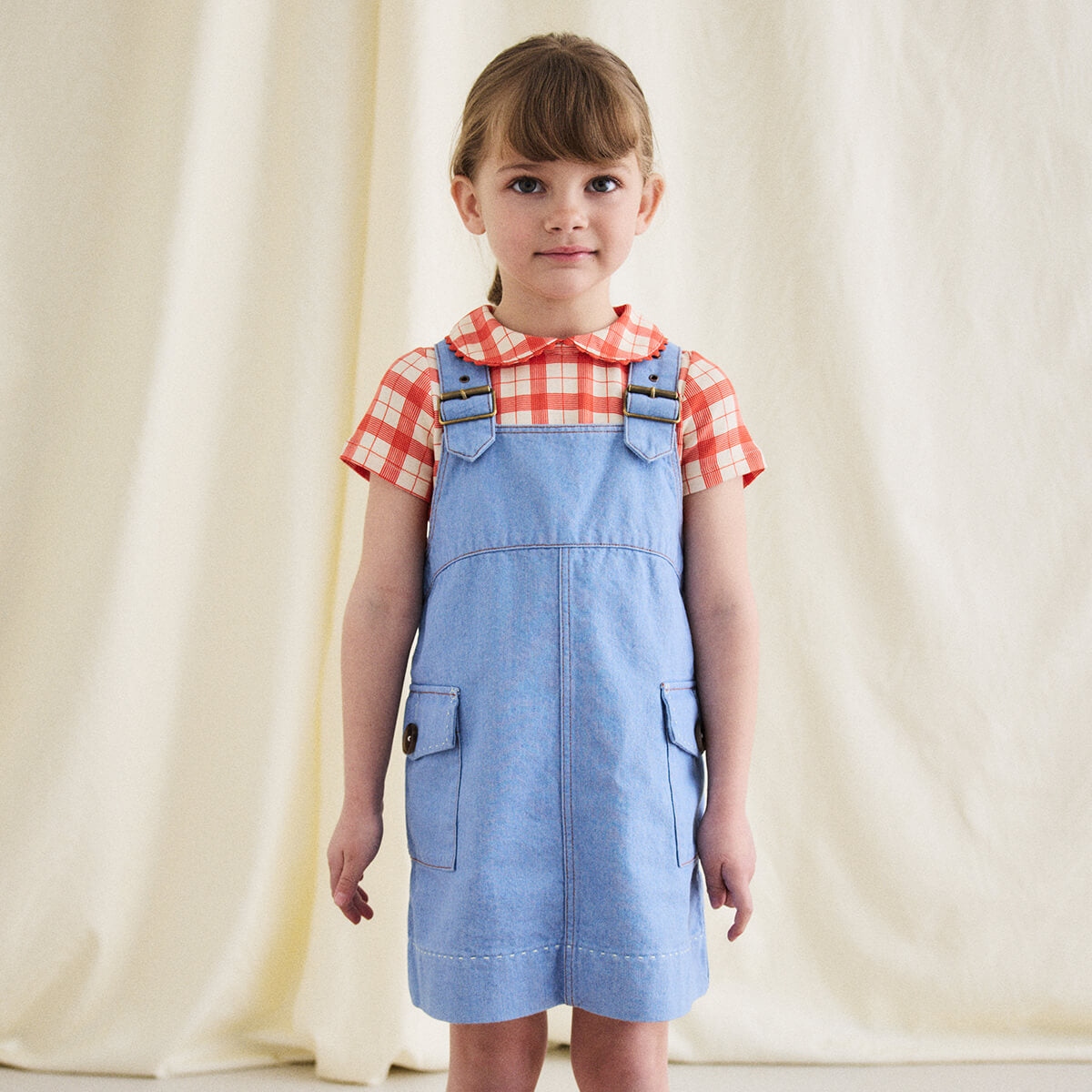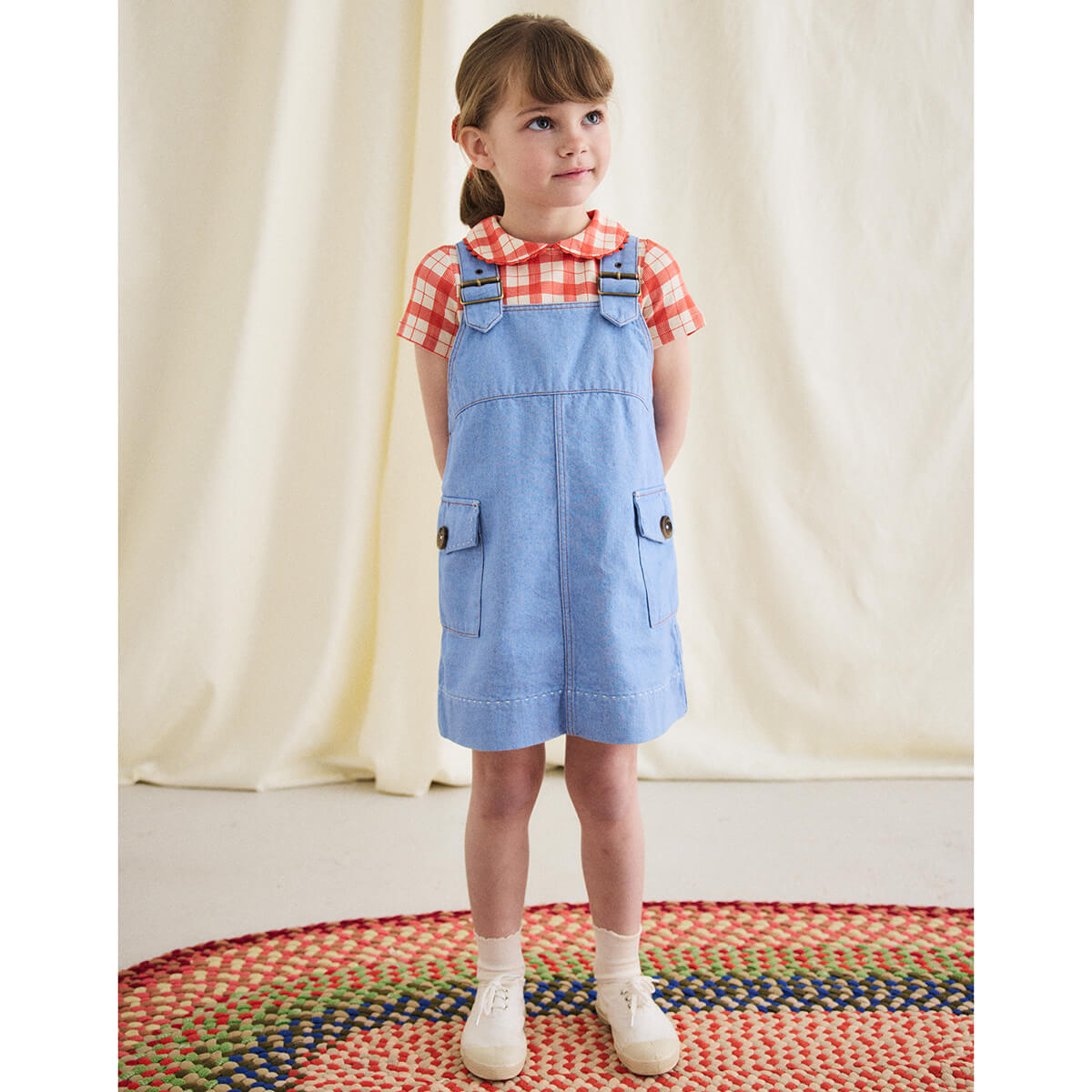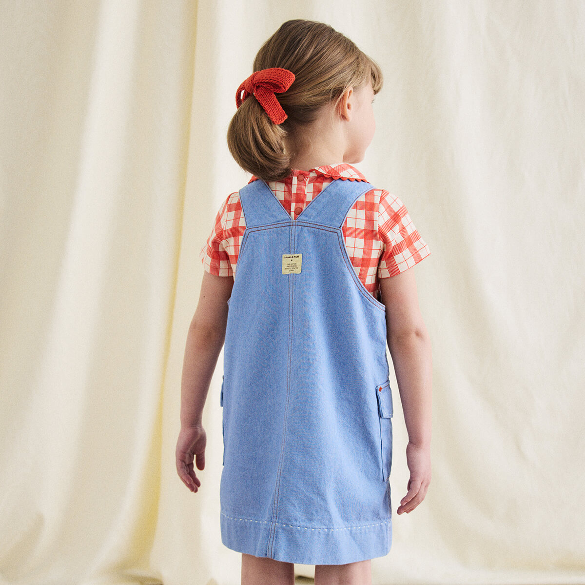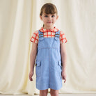 Buckle Jumper Dress by Misha & Puff. From Misha & Puff's denim collection — a vintage-inspired jumper dress in 100% cotton denim, with adjustable buckle straps, two patch pockets with horn button closure, a contrast print lined bib, and contrast topstitch detail. Finished with hand-tacked stitches instead of rivets for softness.