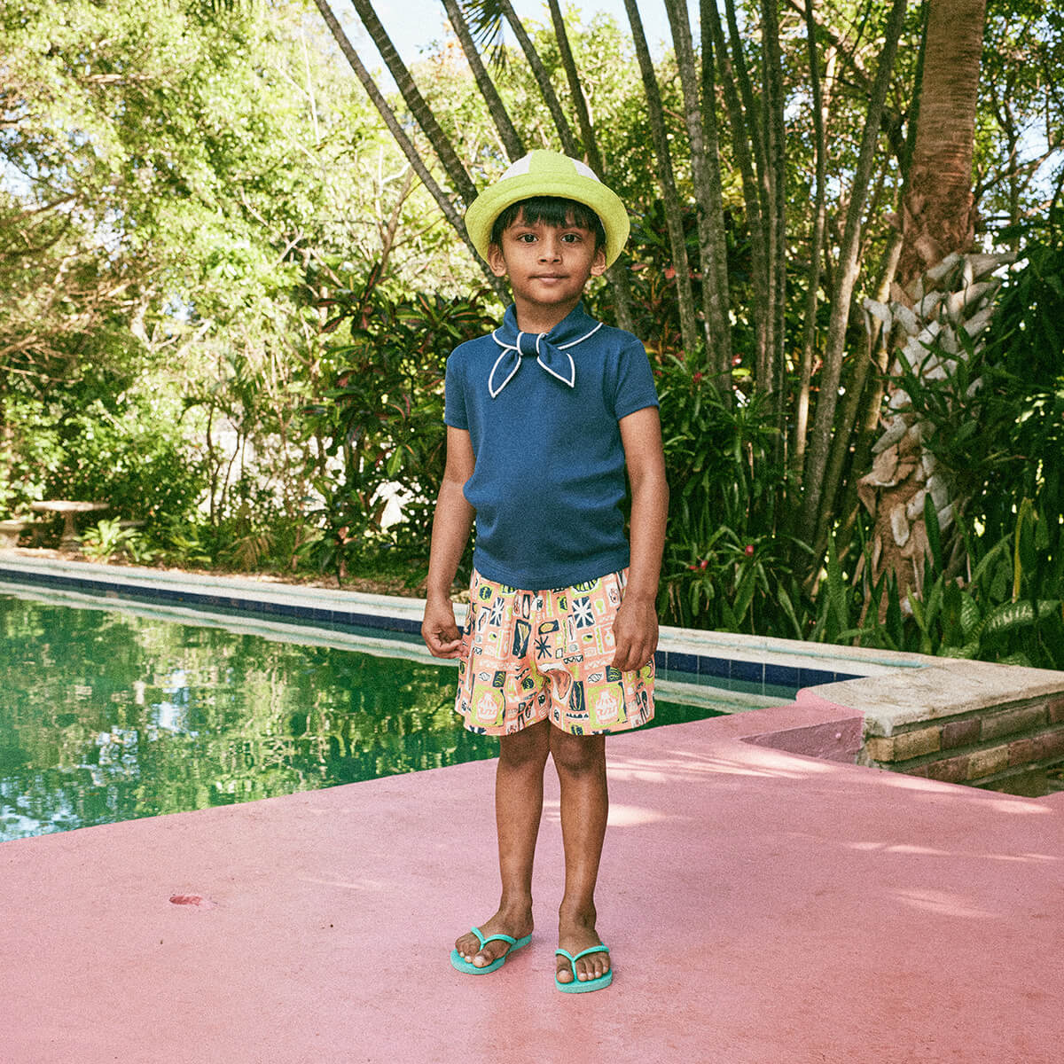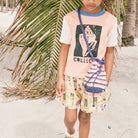 Cabana Short by Misha & Puff. A relaxed pull-on short in Pima cotton, with a gathered elastic waistband. Featuring a hand-crafted graphic print inspired by mid-century vacation prints.