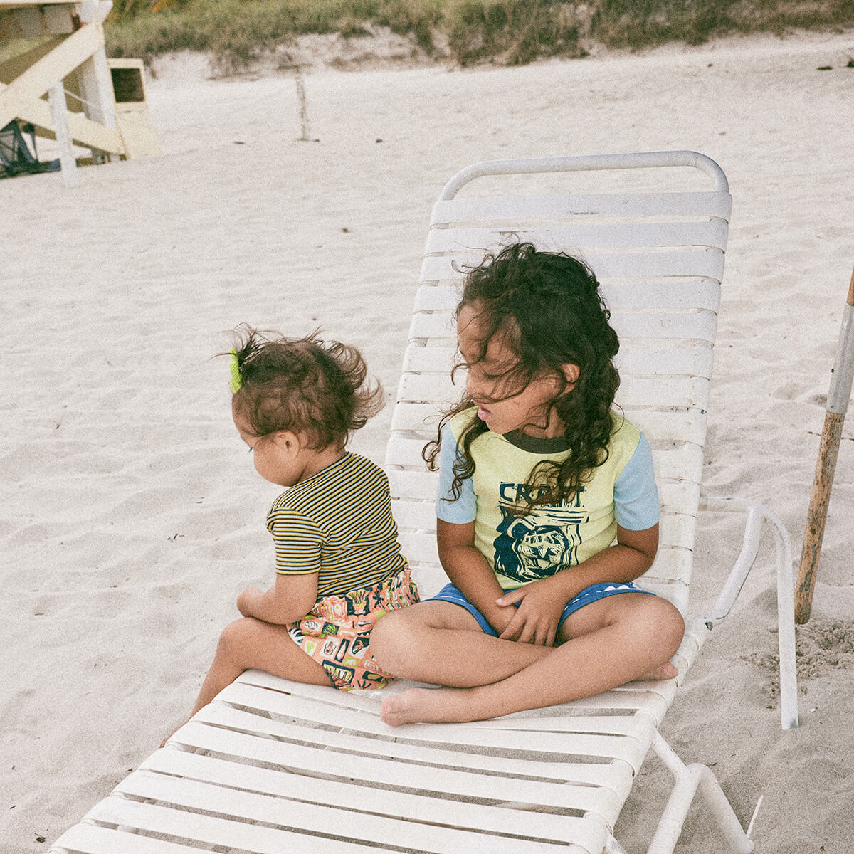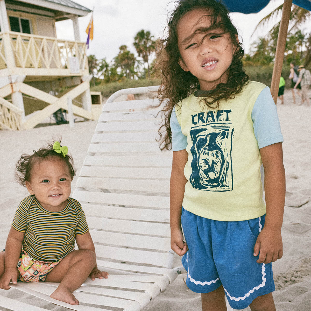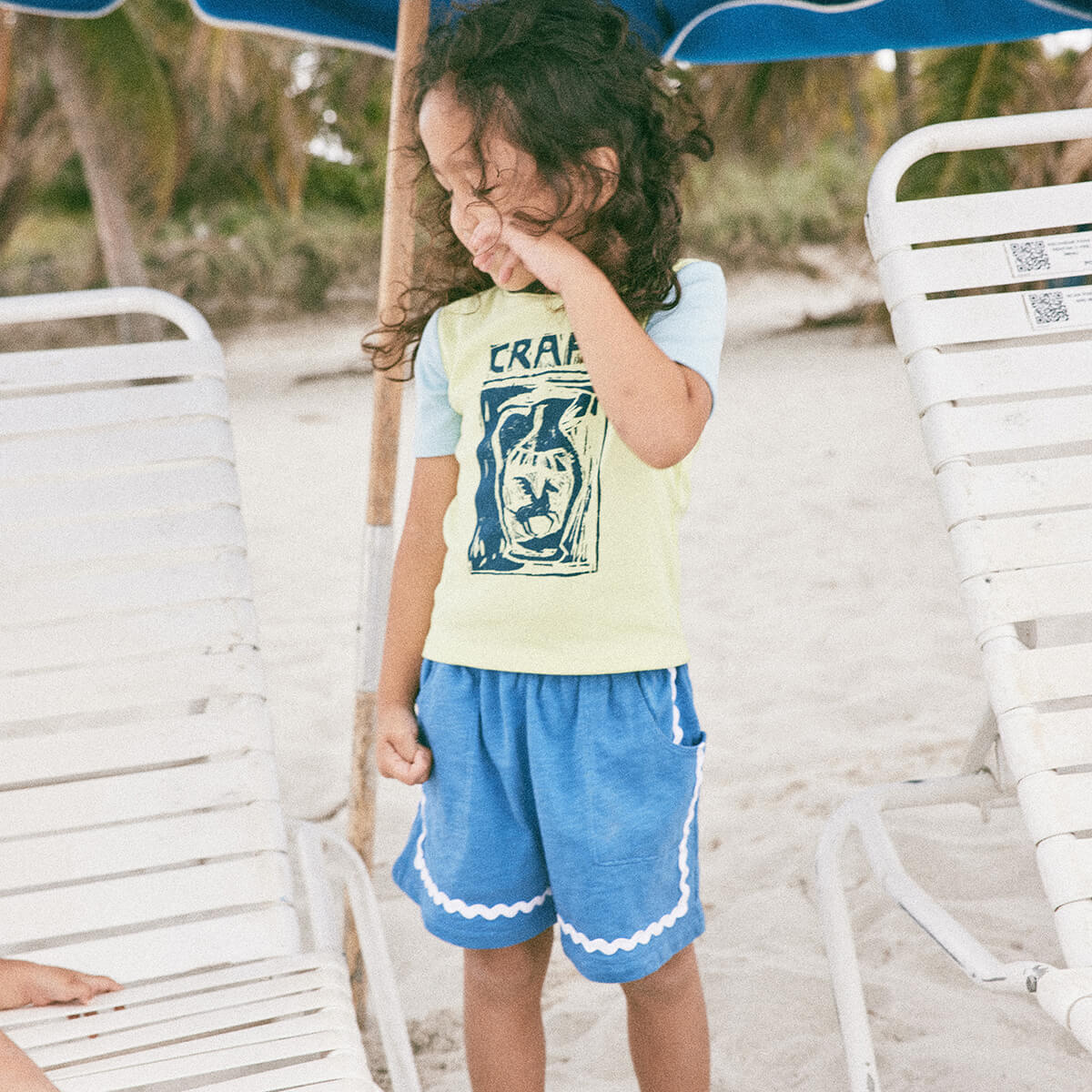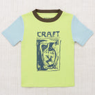 Craft Ringer Tee in Limeade by Misha & Puff. A classic slim-fit ringer tee in soft Pima cotton, with contrasting neckline, sleeves, and body. Featuring a hand-carved and crafted print.