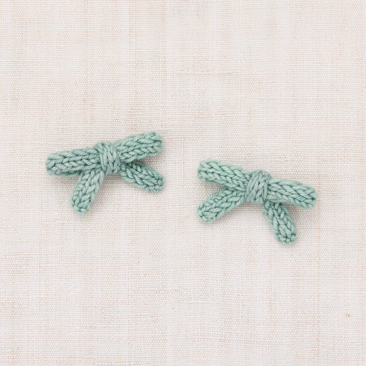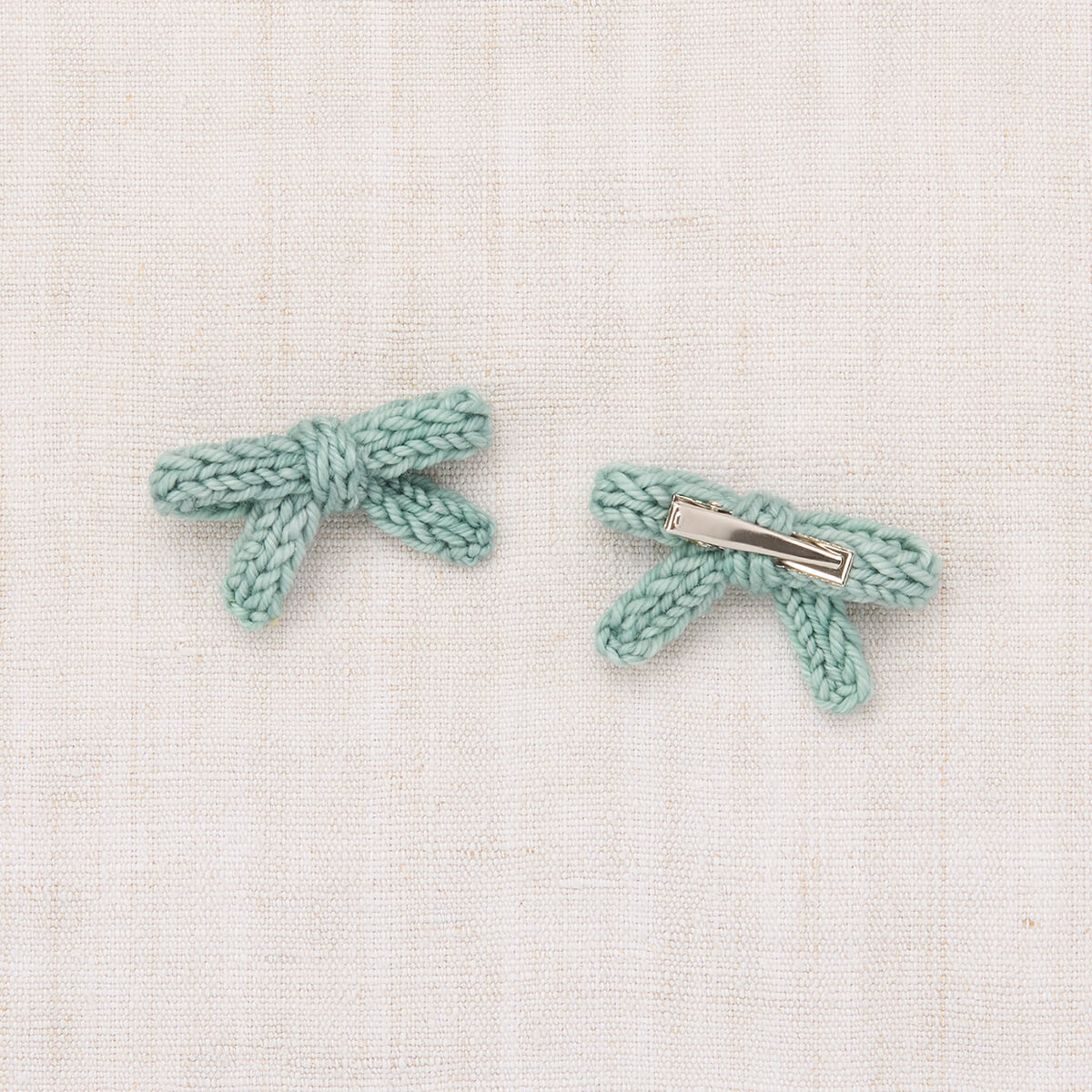 Goldie Bow Set by Misha & Puff. A hand-knit slim bow set in Merino wool, mounted on alligator clips. Perfect for matching your favorite knitwear, adding a pop of color, or gifting to a friend.