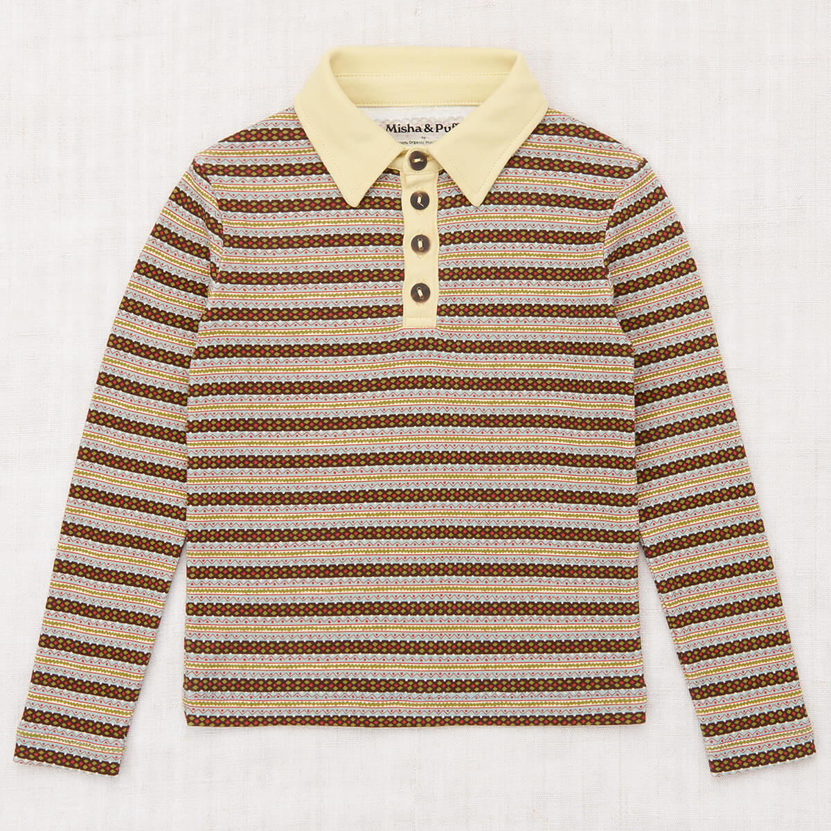 Long Sleeve Polo by Misha & Puff. A long-sleeved polo top in organic Pima cotton, with a contrast collar and placket, and horn button closure.
