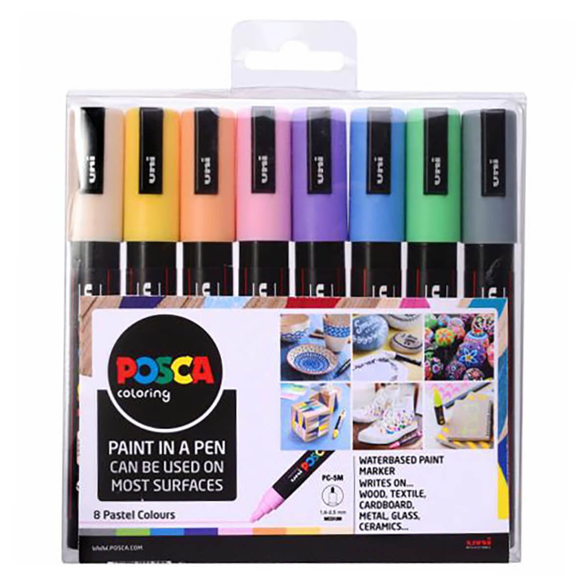 PC-5m 8 Pack Pale by Posca. Water based paint marker pens in soft pale tones. Medium bullet tip which is Poscas most popular and versatile nib. Providing a clear, precise line and beautiful colour, it is ideal for customising porous, irregular surfaces such as wood, stone or concrete. Posca pens can also draw on glass and windows and be removed with warm soapy water.
